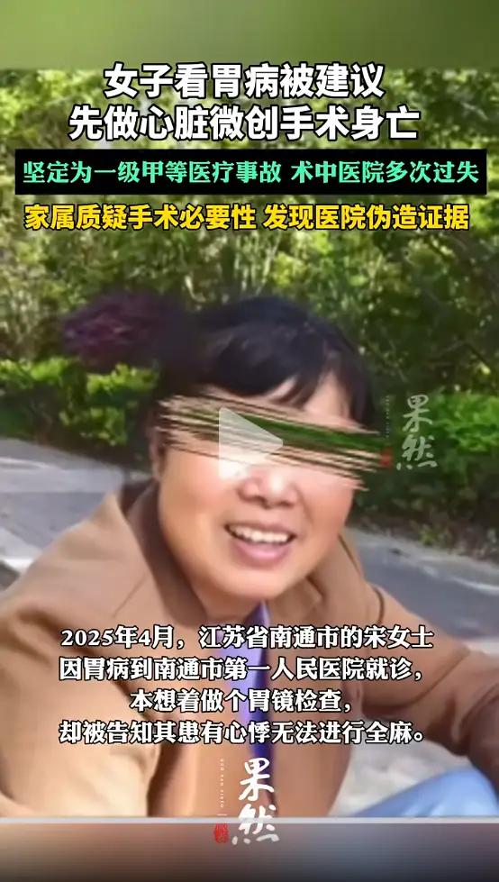 女子看胃病被建议做心脏微创手术身亡,鉴定为一级甲等医疗事故,院方道歉。 关于2025年4月发生在南通市第一人民医院的宋女士医疗事件,以下是详细情况说明和相关背景信息: 一、事件概述 患者信息:宋女士,60岁。 诊疗经过: 2025年4月18日,因“上腹痛7天”在我院消化内科门诊就诊,随后自行回家。 2025年4月27日,因“心悸1年”到我院心血管内科门诊,诊断为室性期前收缩,住院治疗。 4月29日,进行电生理检查及射频消融术。在手术过程中,突发呼吸心跳骤停,经全力抢救无效,患者不幸去世。 事件处理: 医院高度重视,积极配合尸检和医疗事故技术鉴定。 省、市两级鉴定机构认定:手术有适应证,但存在风险沟通不到位、操作未尽谨慎义务,出现了可预见但难以完全避免的并发症,认定为一级甲等医疗事故,医院承担主要责任。 医院尊重鉴定结果,依法依规处理,承担相应责任。 医院已多轮与家属就赔偿事宜协商,但因赔偿金额超出法律规定标准,未能达成一致。医院将继续积极沟通,尽快妥善解决此事。 医院承诺加强医疗安全管理,提升服务质量,接受社会监督。 二、事件背景及争议 据报道,宋女士此前曾因胃病就诊,原计划进行胃镜检查,但因患有心悸,无法全麻,随后转入心血管内科治疗。 事发后,鉴定结果已公布,公安机关也已立案调查。 患者家属对鉴定细节提出质疑,表达尚未得到明确答复。 三、医院情况简介 南通市第一人民医院由储晓彬法定代表,注册资金约26.9亿人民币。 业务范围涵盖综合医疗、护理及健康服务。 历史上曾多次涉及医疗责任纠纷和诉讼,具有一定规模和复杂背景。 四、后续措施 医院将继续与家属沟通,依法妥善处理赔偿事宜。 加强医疗安全和风险管理,防范类似事件再次发生。 欢迎社会各界监督,促进医疗服务持续改进。 五、声明 南通市第一人民医院对宋女士的逝世表示深切哀悼,对家属表示诚挚慰问。我们将以此次事件为警示,不断提升医疗质量与安全水平,守护每一位患者的生命安全。 【注】本说明依据官方公布信息整理,具体细节仍在调查和处理之中,望社会理解与支持。 如有疑问,欢迎联系我院相关部门获取进一步信息。