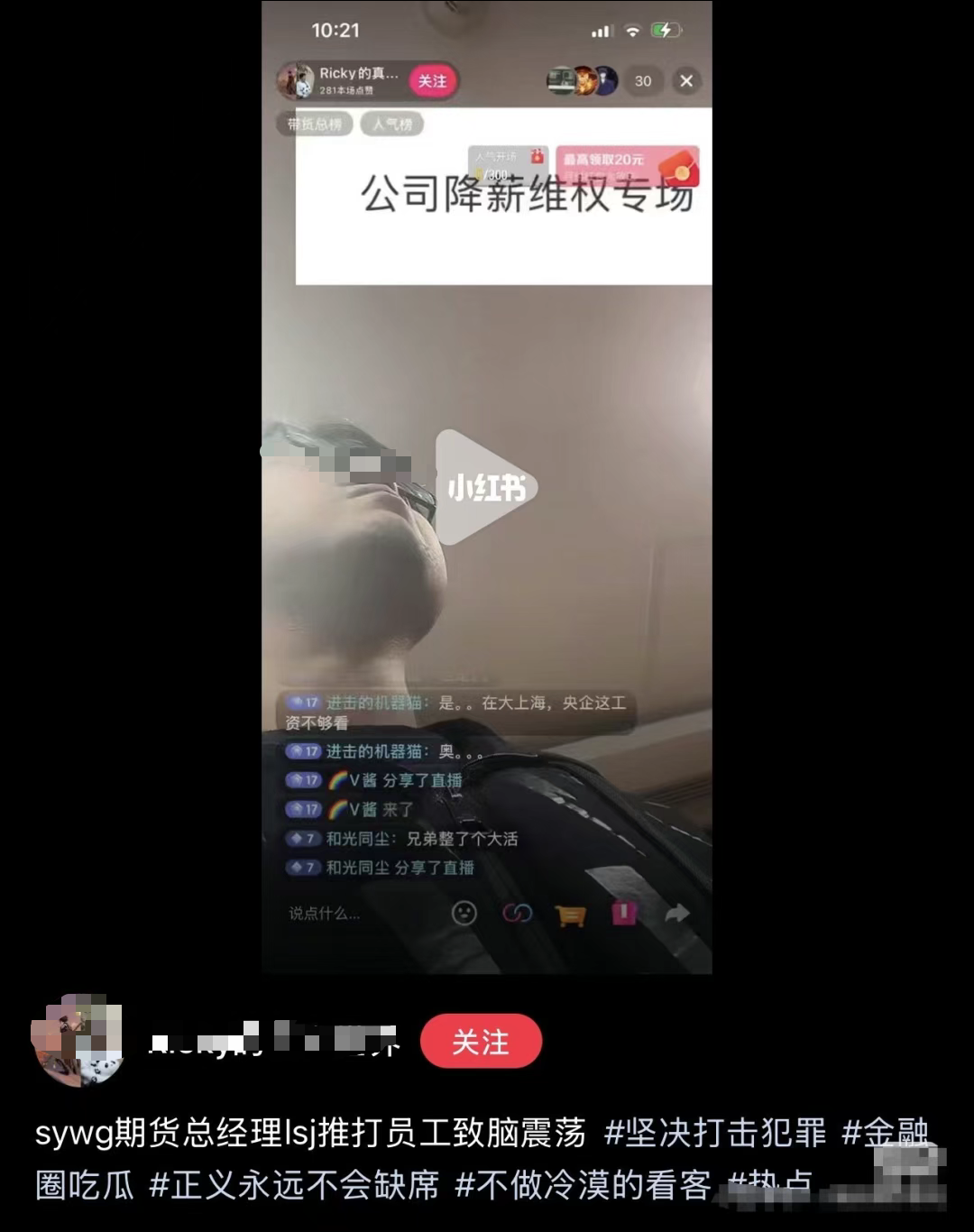 一名疑似申银万国期货员工的网友以“维权”名义开启直播,向公司领导讨要说法。直播画面中,领导对维权员工实施肢体攻击。据网友文案描述,该领导殴打行为导致员工出现脑震荡症状。