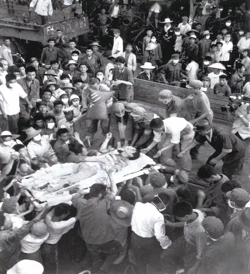 1976年8月5日(唐山地震震后第8天),担架上躺着刚被救出的青年矿工王树斌,身上裹着临时拼凑的被褥,周围挤着数十人——穿工装的群众伸手稳住担架边缘,解放军战士弓身护在旁侧,有人举着枕头要垫稳他的身体。 此时距离7·28地震已过去8天,王树斌所在的煤矿巷道早被坍塌的岩层掩埋,他困在仅容一人蜷缩的狭小空间里,全靠巷道缝隙渗下的泥水维持生命。解放军救援部队排查矿区时,意外捕捉到他微弱的呼救声,因怕大型机械引发二次坍塌,战士们徒手刨开碎石瓦砾,一点点抠出通往他所在空间的通道,才终于把这个在黑暗里熬了8天的青年托出废墟。 照片里的簇拥,是震区“不放弃任何生命”的缩影:当时救援资源极度紧张,但每发现一名幸存者,周边群众、战士都会立刻围拢过来,用人力接力的方式,把人最快送到临时医疗点。王树斌的获救,不仅是个体生命的奇迹,更成了震后鼓舞无数人的精神支点——连困了8天的人都能活下来,震区就有重建的希望。