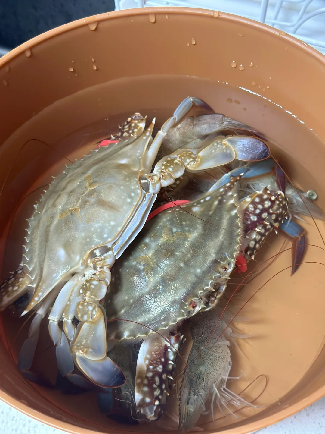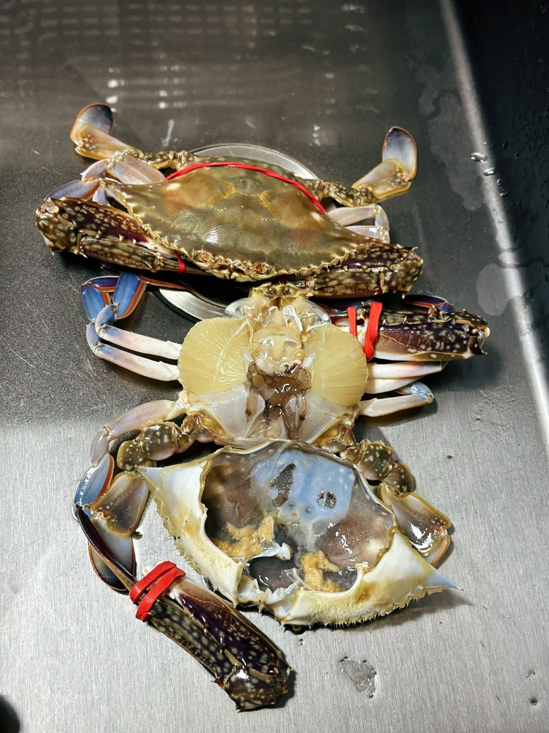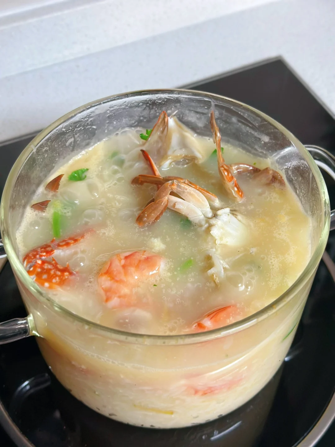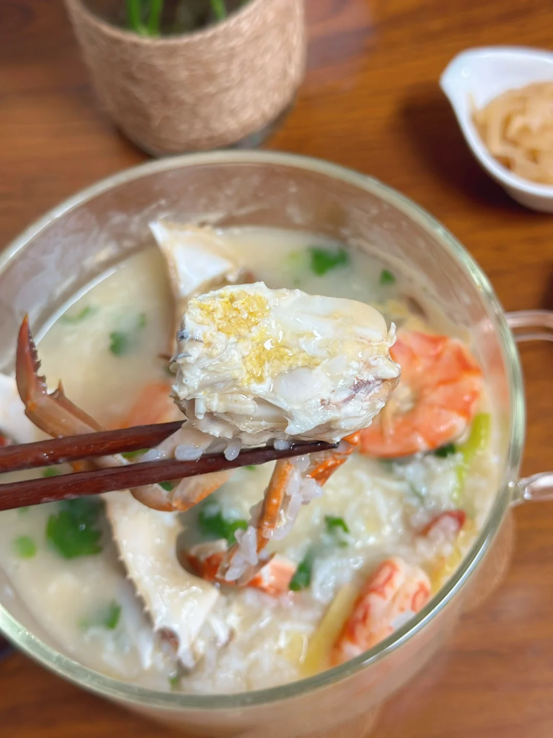 梭子蟹买回来之后赶紧做了想念了很久的蟹粥,太鲜美了吧 简单得说一下做法吧:首先我们把买回来的蟹给处理一下肚子上的那块和腮全部都给清理干净,然后虾去掉虾线,小火爆香葱白段生姜丝儿和虾头,这样做的粥特别香哦,再加入适量的水烧开煮一会儿之后再把提前泡好的大米放进去(还可以放一点香菇碎)煮至八成熟,把虾头葱白段捞起来, 再把处理好的蟹肉和虾放进锅里继续煮,加入适量盐调味儿,出锅前放香菜碎,芹菜粒都可以,根据自己喜好来,最后放一丢丢胡椒粉即可!