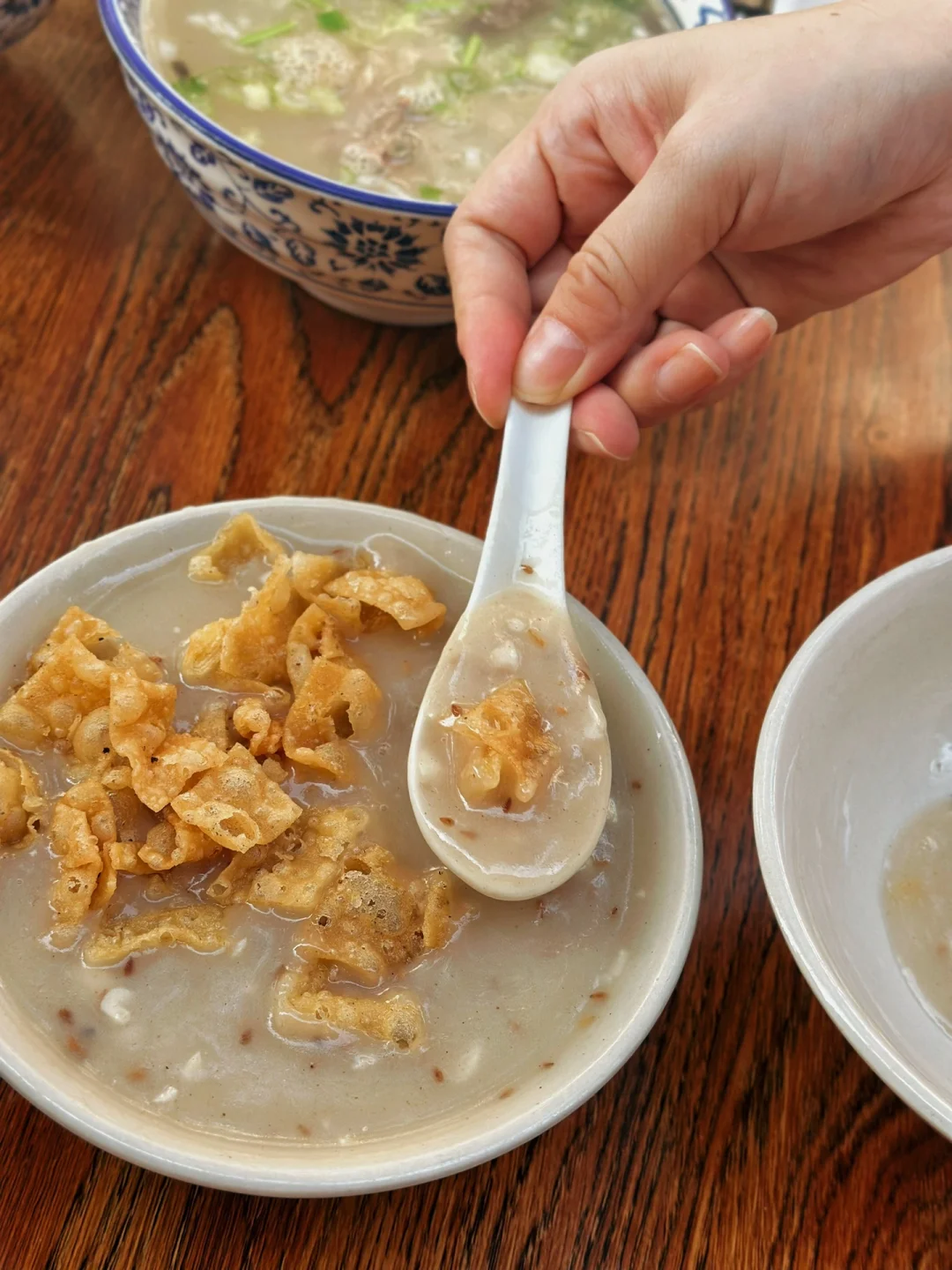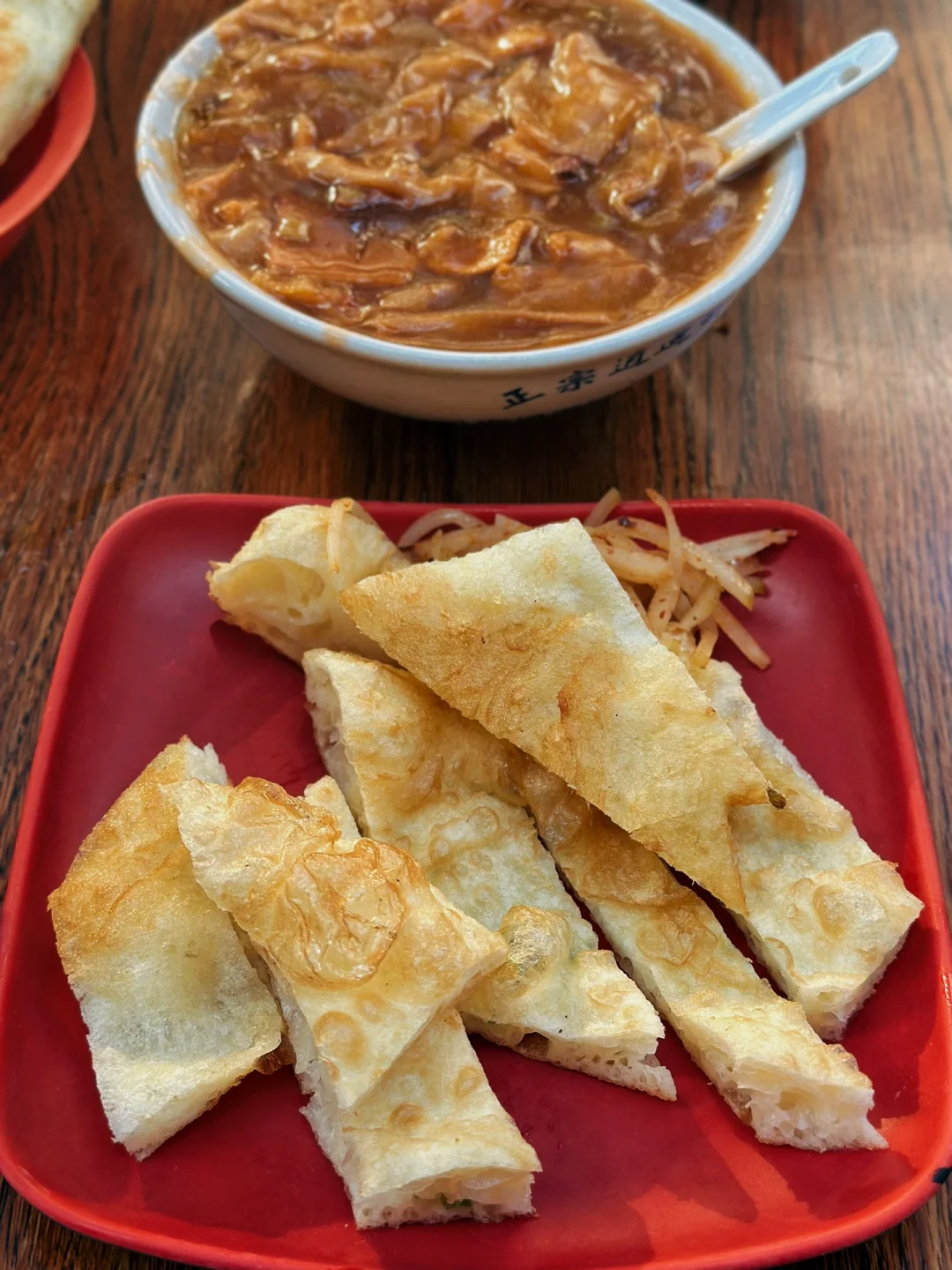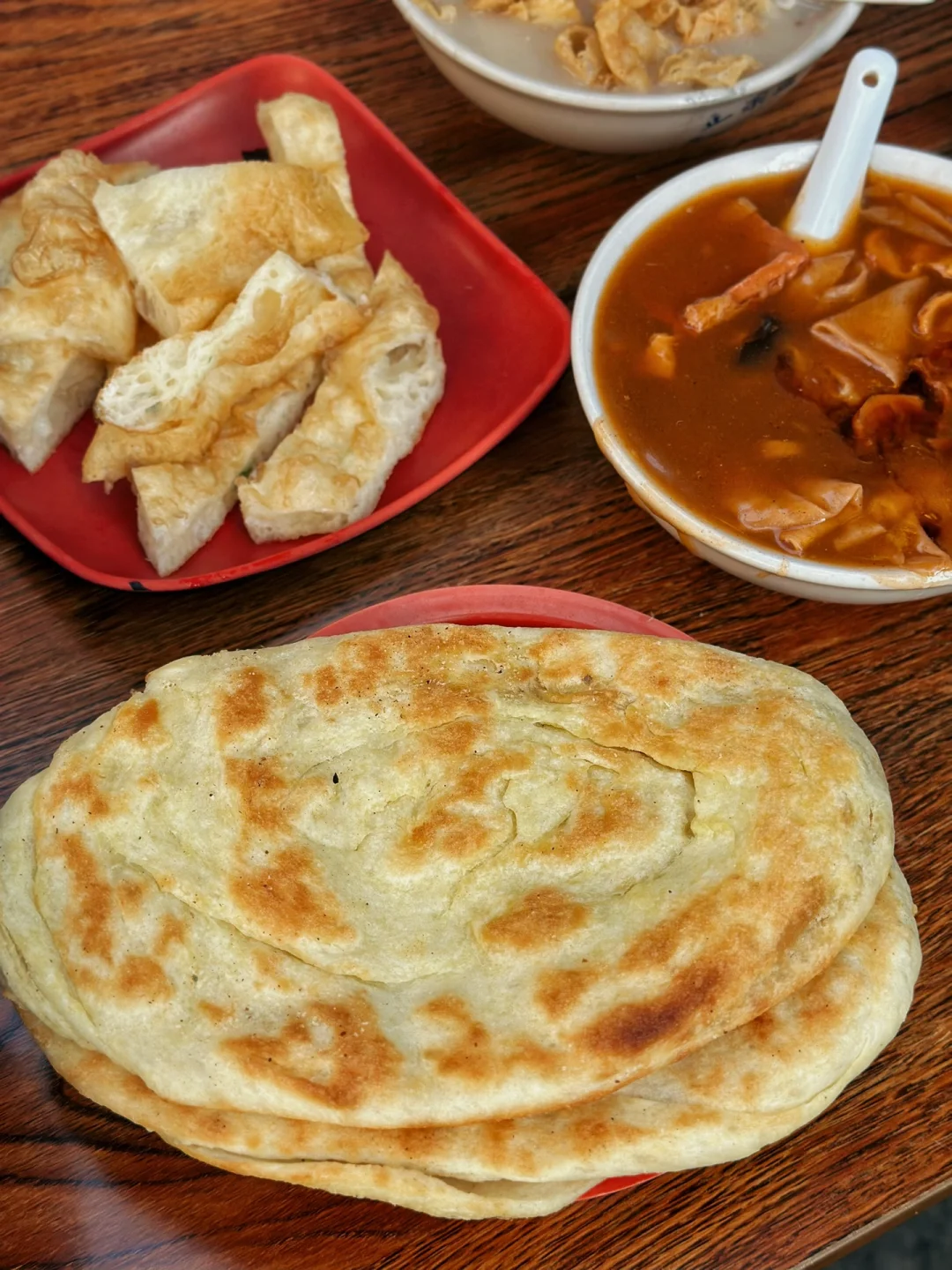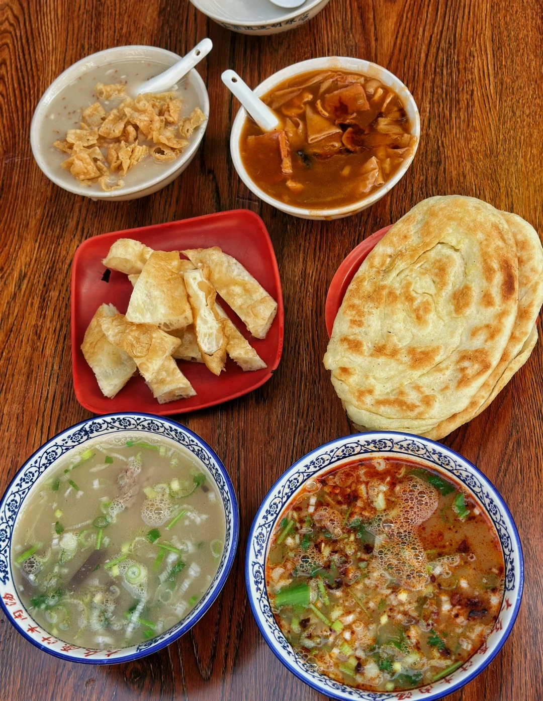 洛阳第一顿早餐分享,昨天睡觉都已经十二点了特意起了个早床去外面吃早餐,牛肉汤店和胡辣汤店的集合!坐在店门口的小桌天气还是蛮舒服的 吃的人也蛮多,牛肉汤是特色(有八块一碗和十块一碗,就是肉多少的区别)本来想吃牛肉面说是早餐木有,汤喝了一口有点淡,旁边有放一碗盐自己可以➕,我们猜测的是可能有人就喜欢它的原滋原味吧 学着旁边人吃的样子把那个饼撕成一条一条的放在汤里感觉还不错,胡辣汤本来挺期待的但是味道太浓郁了吃了一口果断放弃了,反而是油茶我觉得还行! 性价比挺高的这一顿一顿才33大洋,幸福指数挺高的