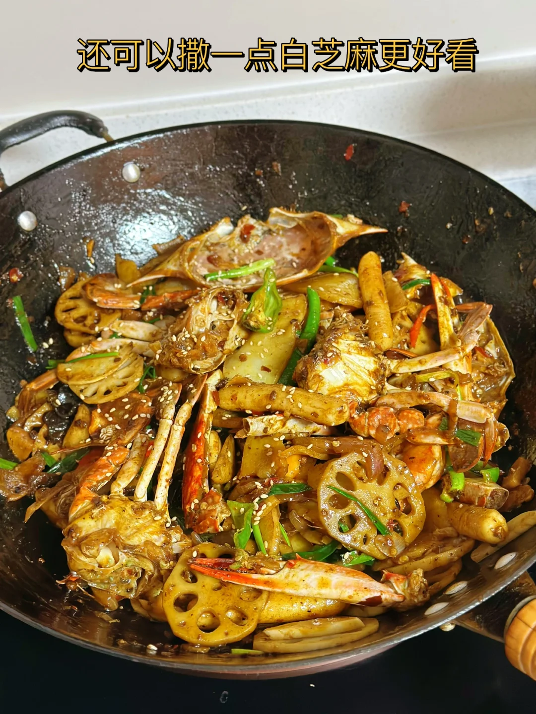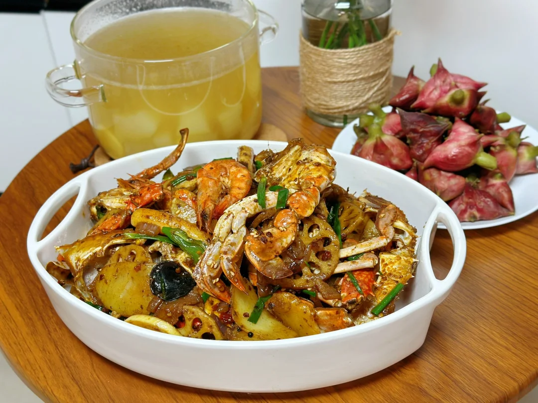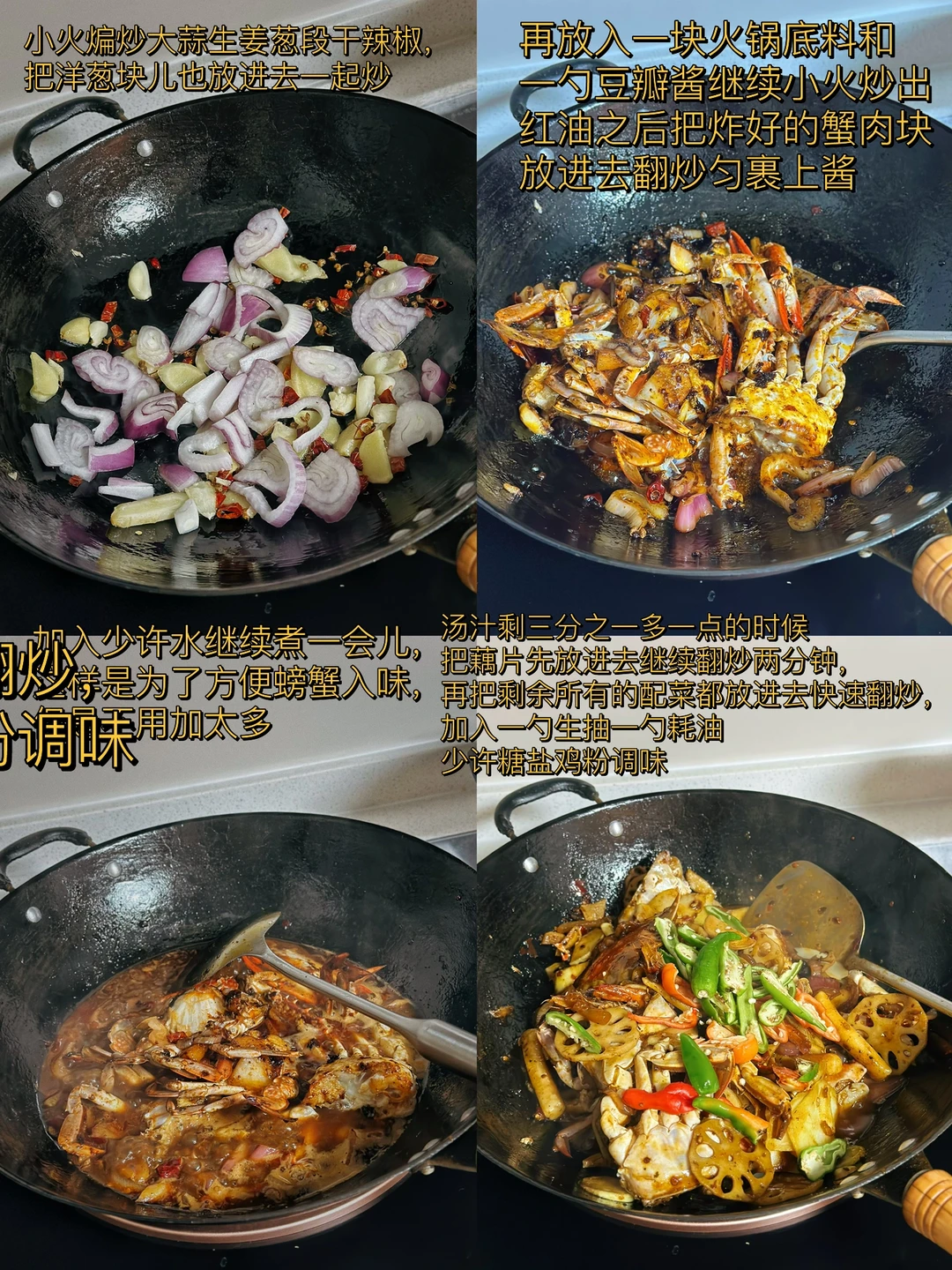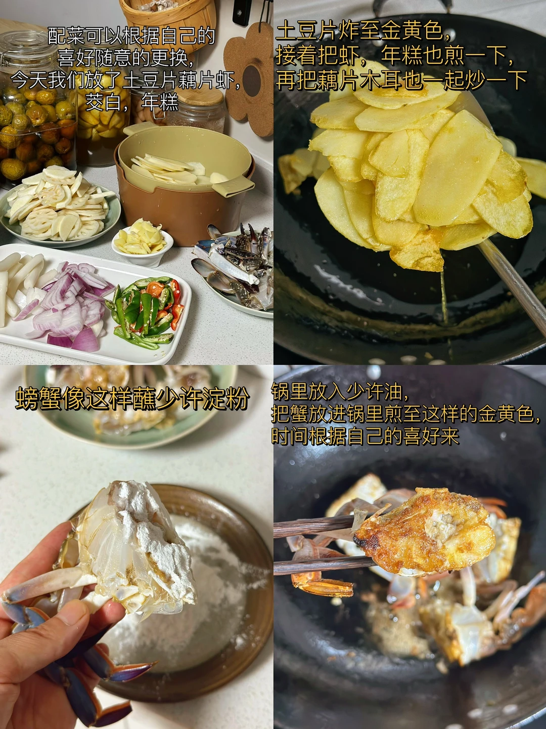 1. 最近正好是吃梭子蟹的季节我们这里大的55小的4540都有 2. 先把螃蟹的盖子弄开,然后把里面的腮肚子上的那个也给弄掉,然后身体一分为二把他的大钳子用刀背轻轻的拍一下方便等会入味 3. 配菜可以根据自己的喜好随意的更换,今天我们放了土豆片藕片虾,茭白,年糕 4. 螃蟹像这样蘸少许淀粉,锅里放入少许油,把蟹放进锅里煎至这样的金黄色,时间根据自己的喜好来 5. 土豆片炸至金黄色,接着把虾,年糕也煎一下,再把藕片木耳也一起炒一下 6. 小火煸炒大蒜生姜葱段干辣椒,把洋葱块儿也放进去一起炒 7. 再放入一块火锅底料和一勺豆瓣酱继续小火炒出红油之后把炸好的蟹肉块放进去翻炒匀裹上酱 8. 加入少许水继续煮一会儿,这样是为了方便螃蟹入味,但是不用加太多 9. 汤汁剩三分之一多一点的时候把藕片先放进去继续翻炒两分钟,再把剩余所有的配菜都放进去快速翻炒,加入一勺生抽一勺耗油少许糖盐鸡粉调味 10. 出锅前撒入多一点的蒜苗段或者是葱段都可以很提香尝一下味道缺啥再放点啥就可以了 11. 还可以撒一点白芝麻更好看,这样做真的超级入味儿,哈哈口水横流吧,下饭下酒菜都绝了 12. 新鲜的菱角又嫩又脆太好吃了