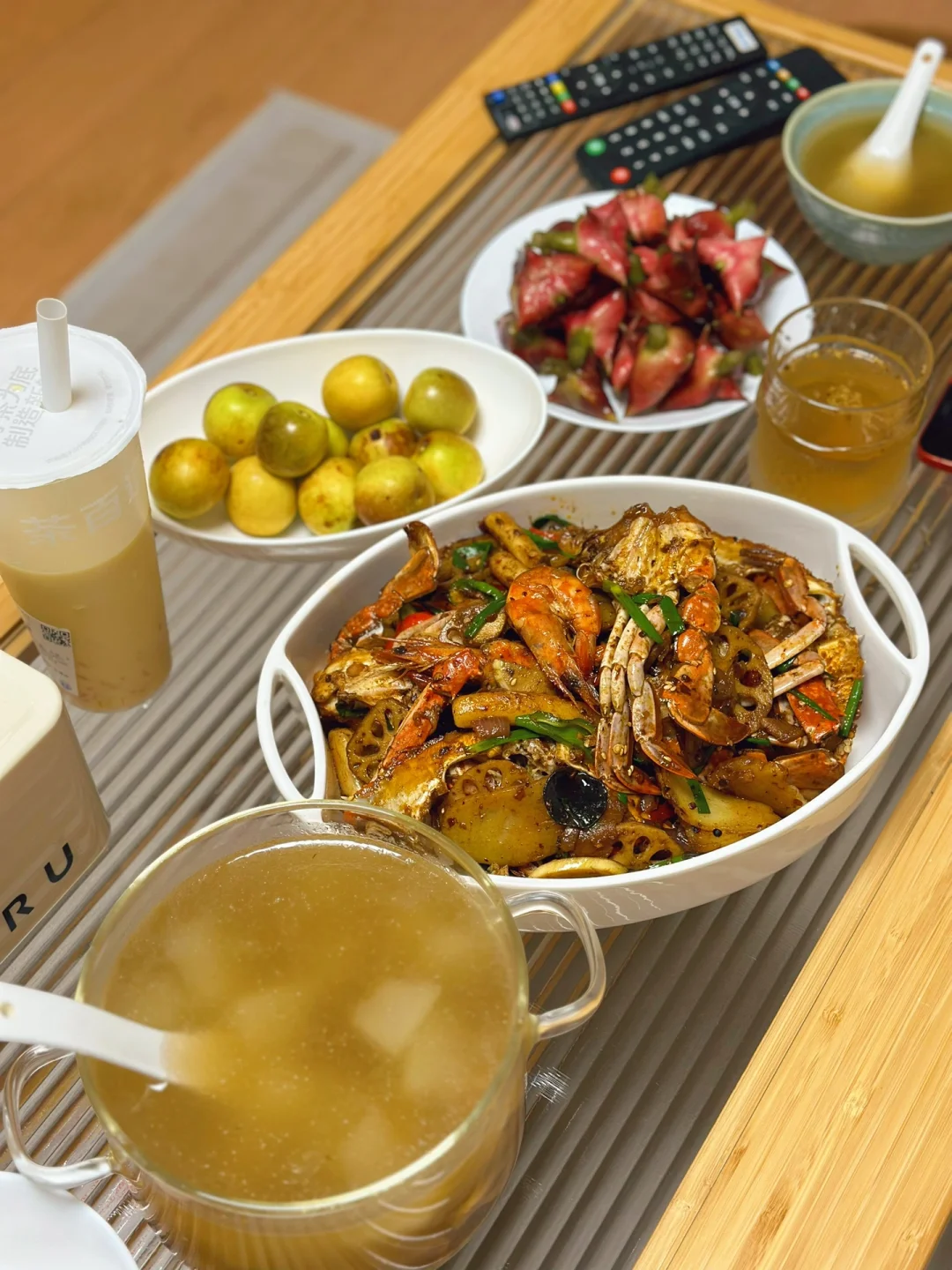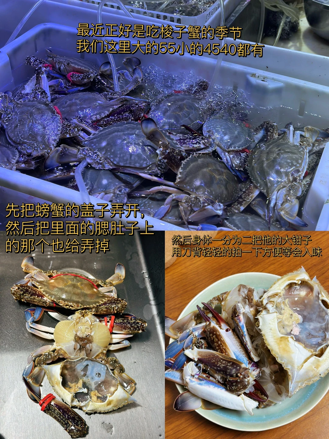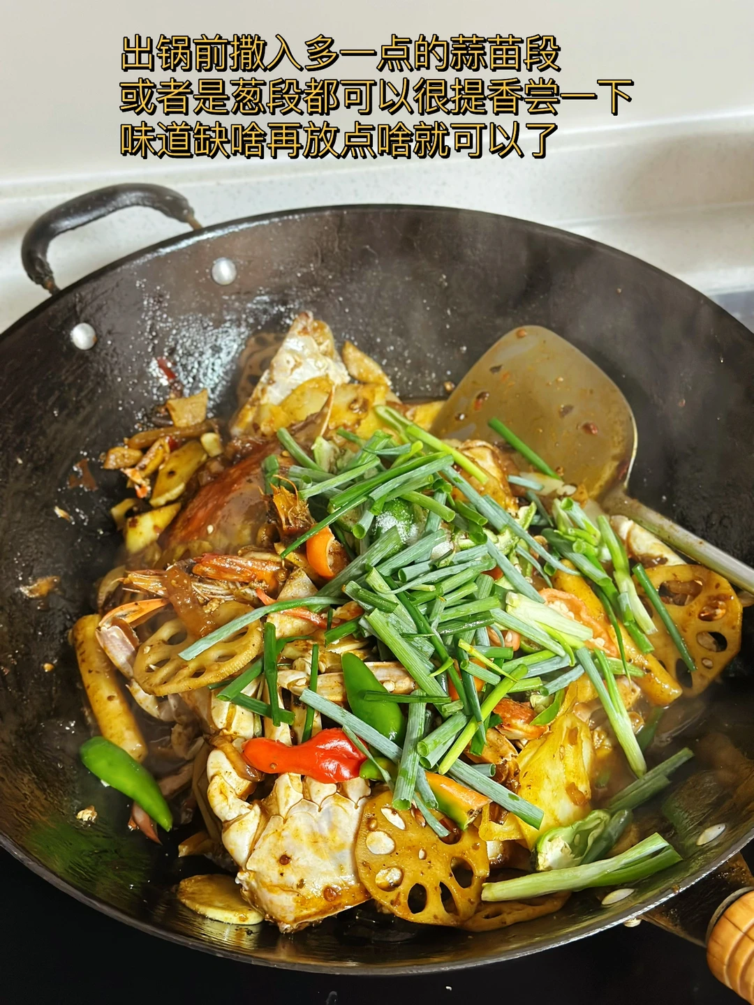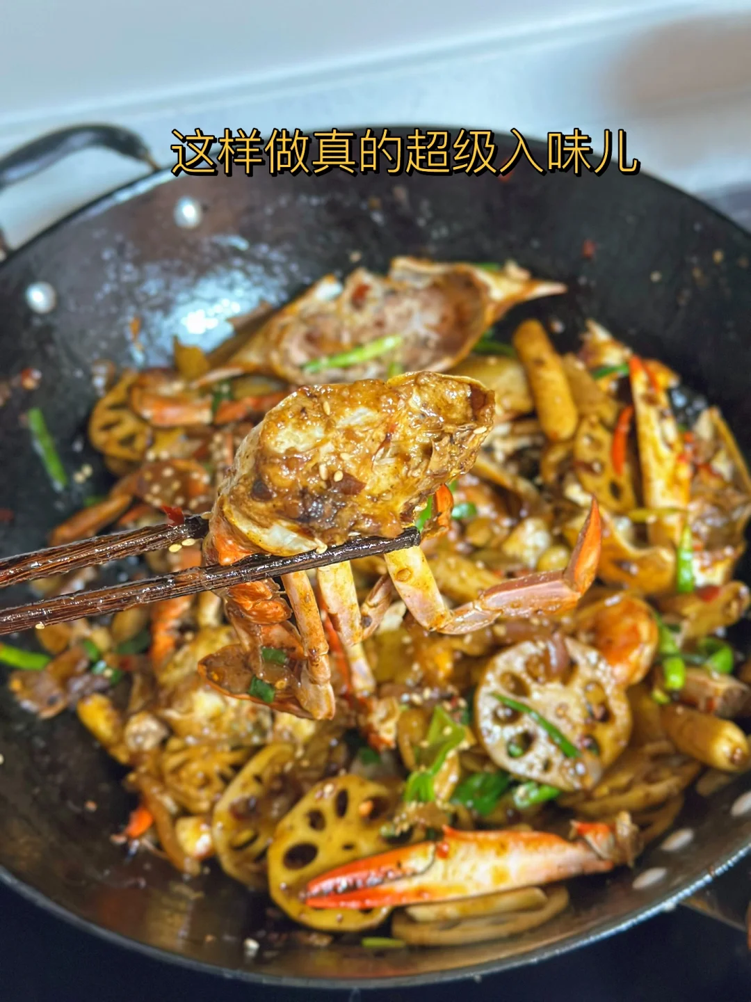 1. 最近正好是吃梭子蟹的季节我们这里大的55小的4540都有 2. 先把螃蟹的盖子弄开,然后把里面的腮肚子上的那个也给弄掉,然后身体一分为二把他的大钳子用刀背轻轻的拍一下方便等会入味 3. 配菜可以根据自己的喜好随意的更换,今天我们放了土豆片藕片虾,茭白,年糕 4. 螃蟹像这样蘸少许淀粉,锅里放入少许油,把蟹放进锅里煎至这样的金黄色,时间根据自己的喜好来 5. 土豆片炸至金黄色,接着把虾,年糕也煎一下,再把藕片木耳也一起炒一下 6. 小火煸炒大蒜生姜葱段干辣椒,把洋葱块儿也放进去一起炒 7. 再放入一块火锅底料和一勺豆瓣酱继续小火炒出红油之后把炸好的蟹肉块放进去翻炒匀裹上酱 8. 加入少许水继续煮一会儿,这样是为了方便螃蟹入味,但是不用加太多 9. 汤汁剩三分之一多一点的时候把藕片先放进去继续翻炒两分钟,再把剩余所有的配菜都放进去快速翻炒,加入一勺生抽一勺耗油少许糖盐鸡粉调味 10. 出锅前撒入多一点的蒜苗段或者是葱段都可以很提香尝一下味道缺啥再放点啥就可以了 11. 还可以撒一点白芝麻更好看,这样做真的超级入味儿,哈哈口水横流吧,下饭下酒菜都绝了 12. 新鲜的菱角又嫩又脆太好吃了