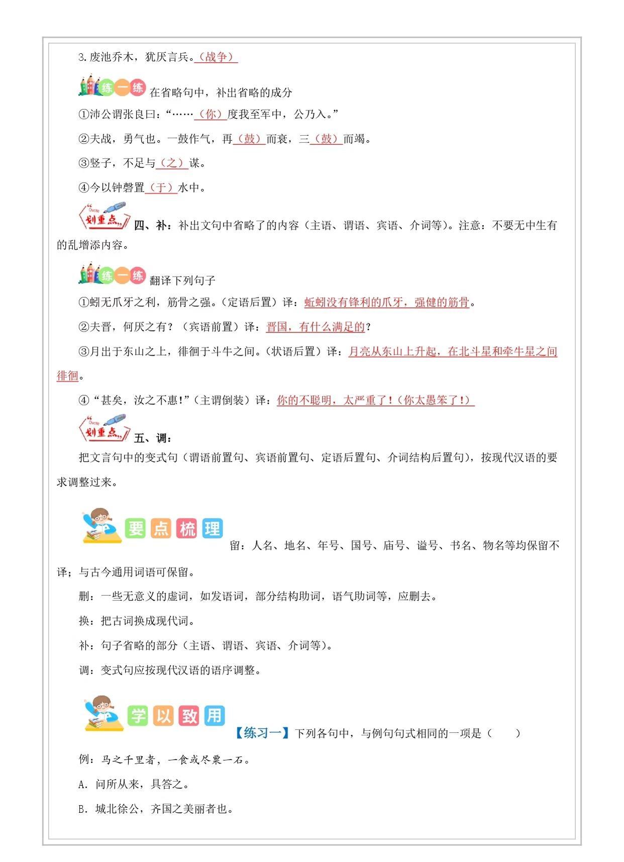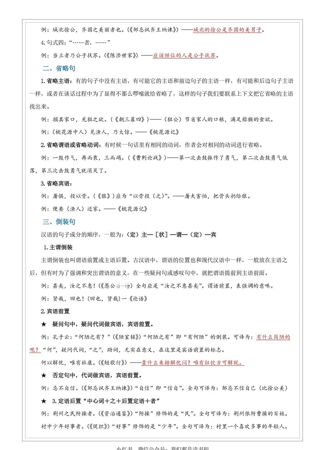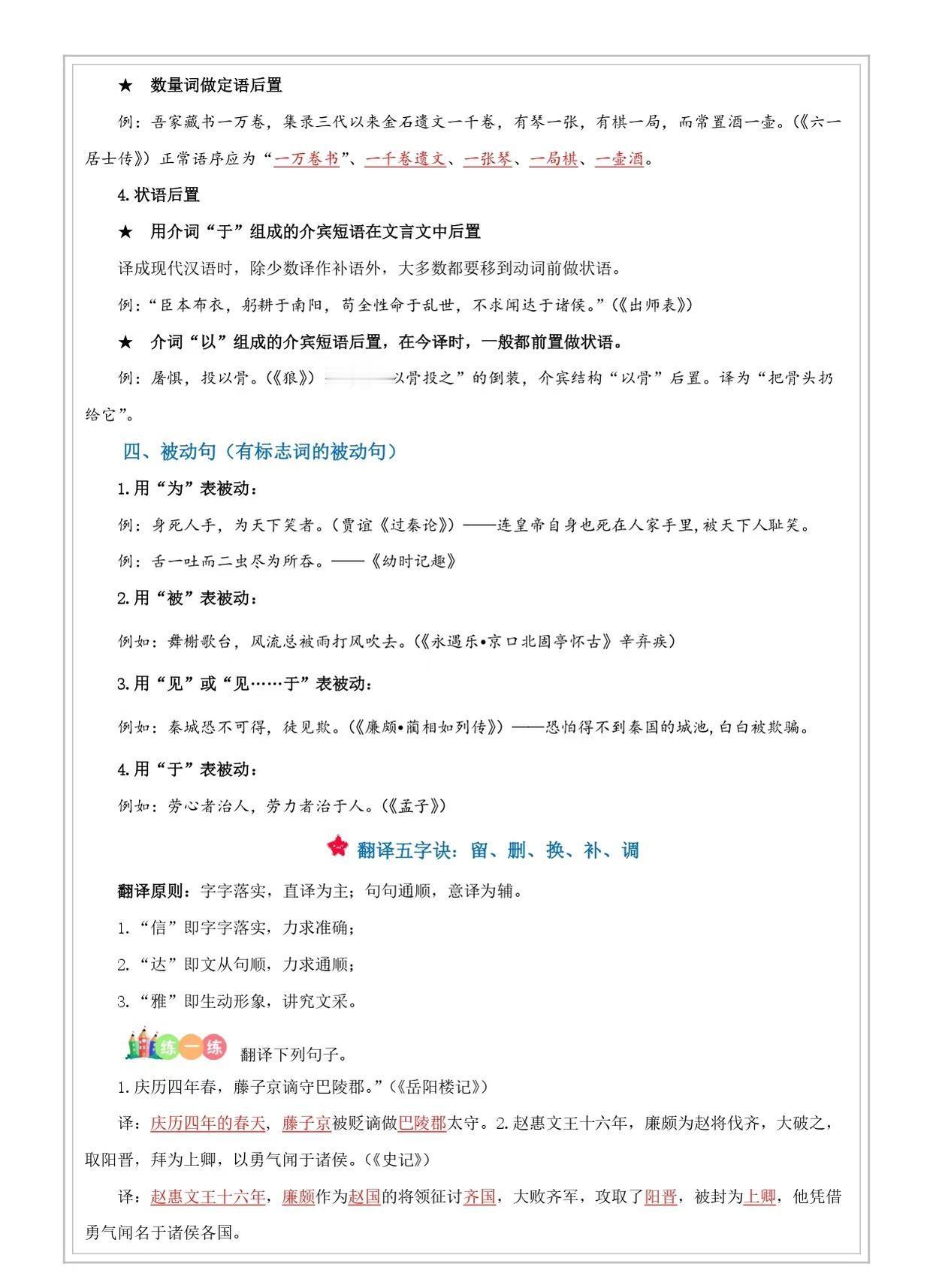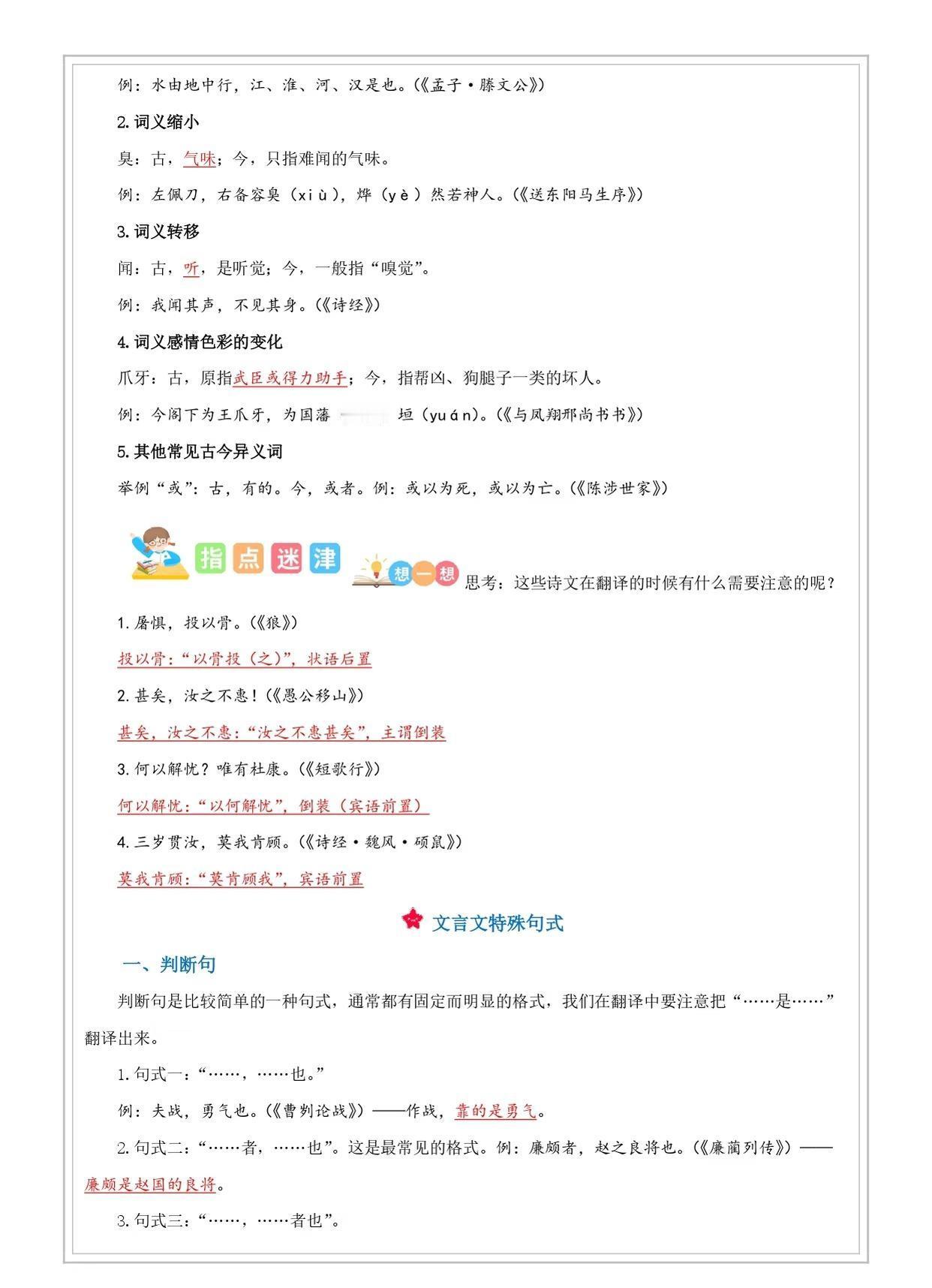 古文:文言文阅读之句式 一、词类活用 1.名词用作动词。 例:“雨雪霏霏”“天雨墙坏”。雨:下雨。 例“驴不胜怒,蹄之”。蹄:用蹄踢。 2.形容词用作动词。 例:“天下苦秦久矣”。苦:苦于,被压迫。 例:“吾妻之美我者,私我也”。美:认为……美。 3.名词作状语。 例:“群臣吏民能面刺寡人之过者”。 面:当面。 二、通假字 1.不亦说乎。“说”通“悦”,意思是:高兴。《论语·学而》 2路转溪桥忽见。“见”通“现”,意思是:显现,出现。《西江月》 3.食之不能尽其材。“食”通“饲”,意思是:喂养。《马说》 三、一词多义 (一)举 1. 抬:举头望明月,低头思故乡。(《静夜思》) 2. 发起,兴起:今亡亦死,举大计亦死。(《陈涉世家》) 3. 全:举世无双。 4. 提出:举一反三。 5. 任用:管夷吾举于士。(《生于忧患,死于安乐》) (二)道 1. 道路:会天大雨,道不通。(《陈涉世家》) 2. 道义:伐无道,诛暴秦。(《陈涉世家》) 3. 方法:策之不以其道。(《马说》) 4. 说:不足为外人道也。(《桃花源记》) 四、古今异义 1.词义扩大江河:古,专指长江和黄河;今,普通名词,成为河流的通名。 例:水由地中行,江、淮、河、汉是也。(《孟子·滕文公》) 2.词义缩小 臭:古,气味;今,只指难闻的气味。 例:左佩刀,右备容臭(xiù),烨(yè)然若神人。(《送东阳马生序》) 3.词义转移 闻:古,听,是听觉;今,一般指“嗅觉”。 例:我闻其声,不见其身。(《诗经》) 4.词义感情色彩的变化 爪牙:古,原指武臣或得力助手;今,指帮凶、狗腿子一类的坏人。 例:今阁下为王爪牙,为国藩(fān)垣(yuán)。(《与凤翔邢尚书书》) 5.其他常见古今异义词 举例“或”:古,有的。今,或者。例:或以为死,或以为亡。(《陈涉世家》) 小升初 中考 语文 古文