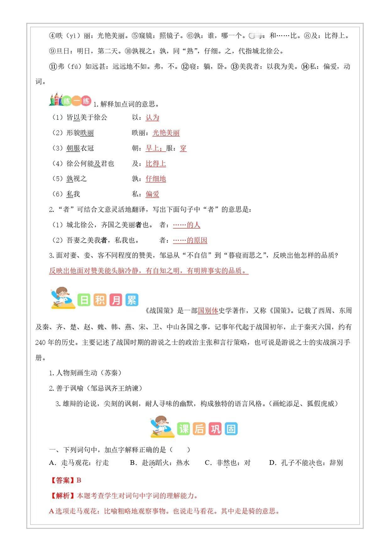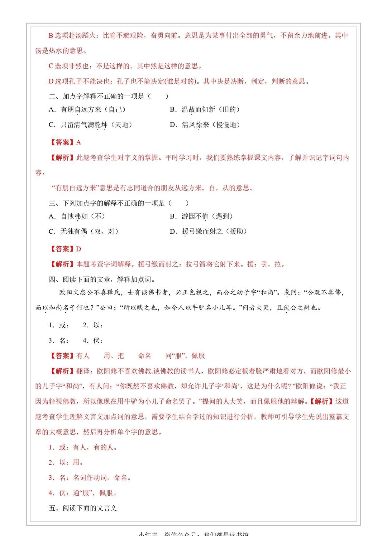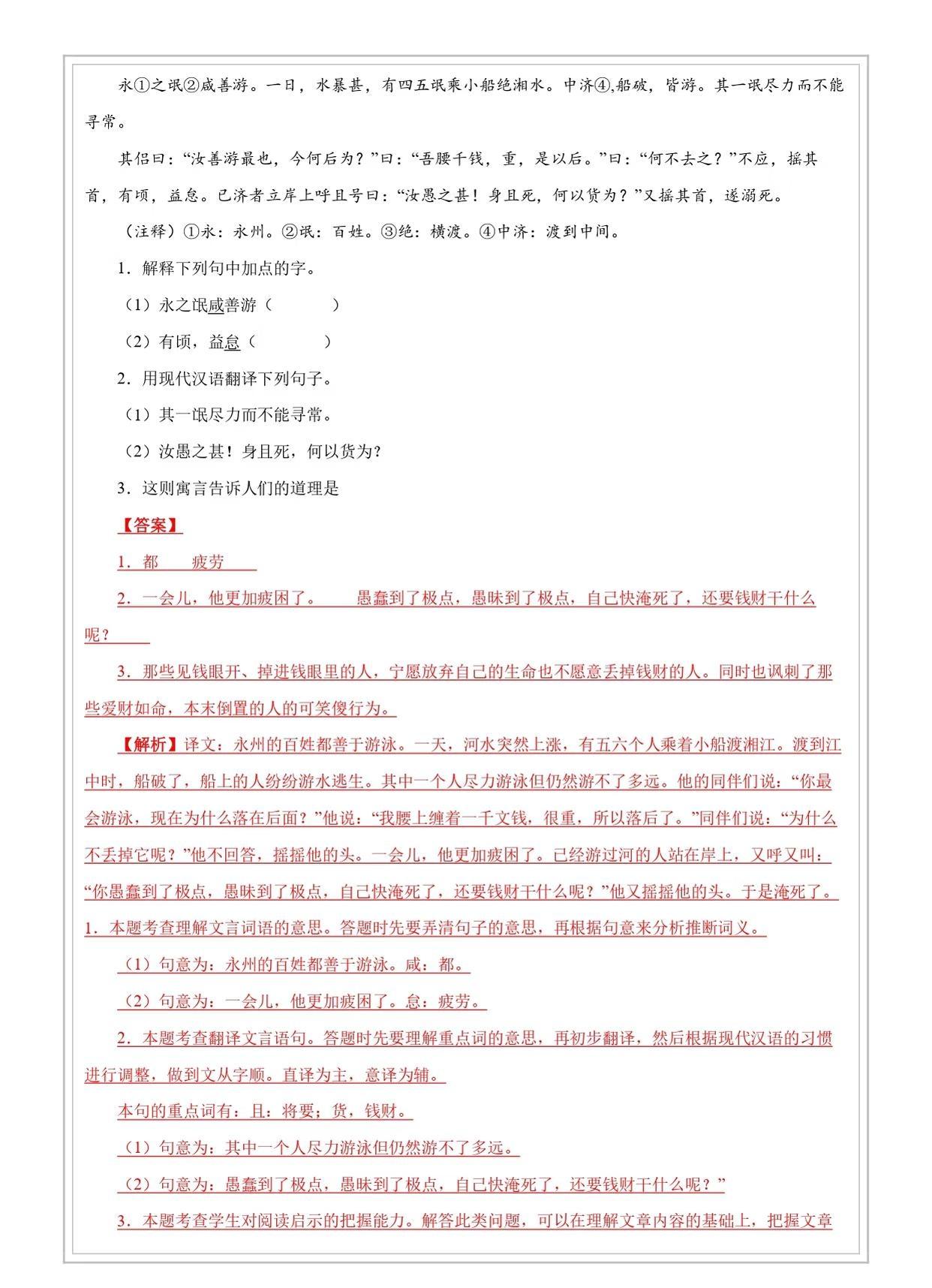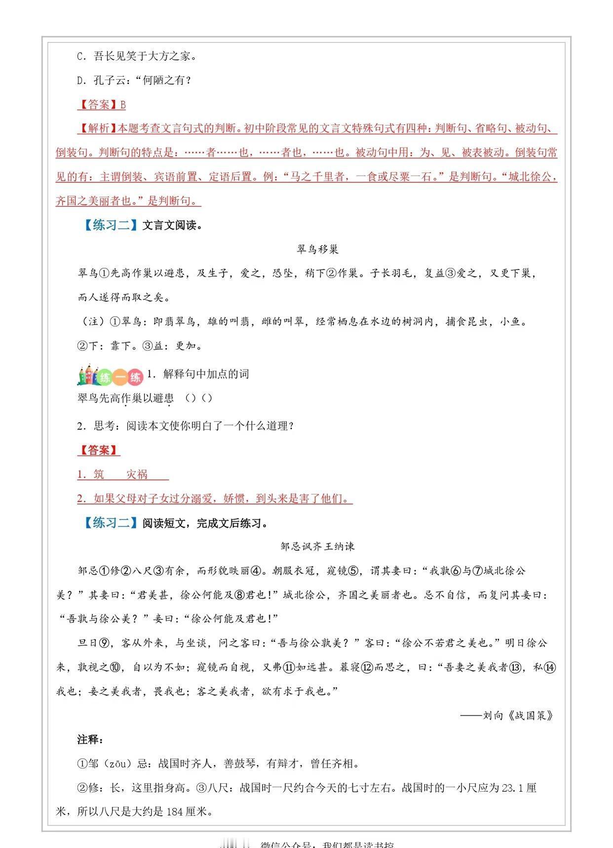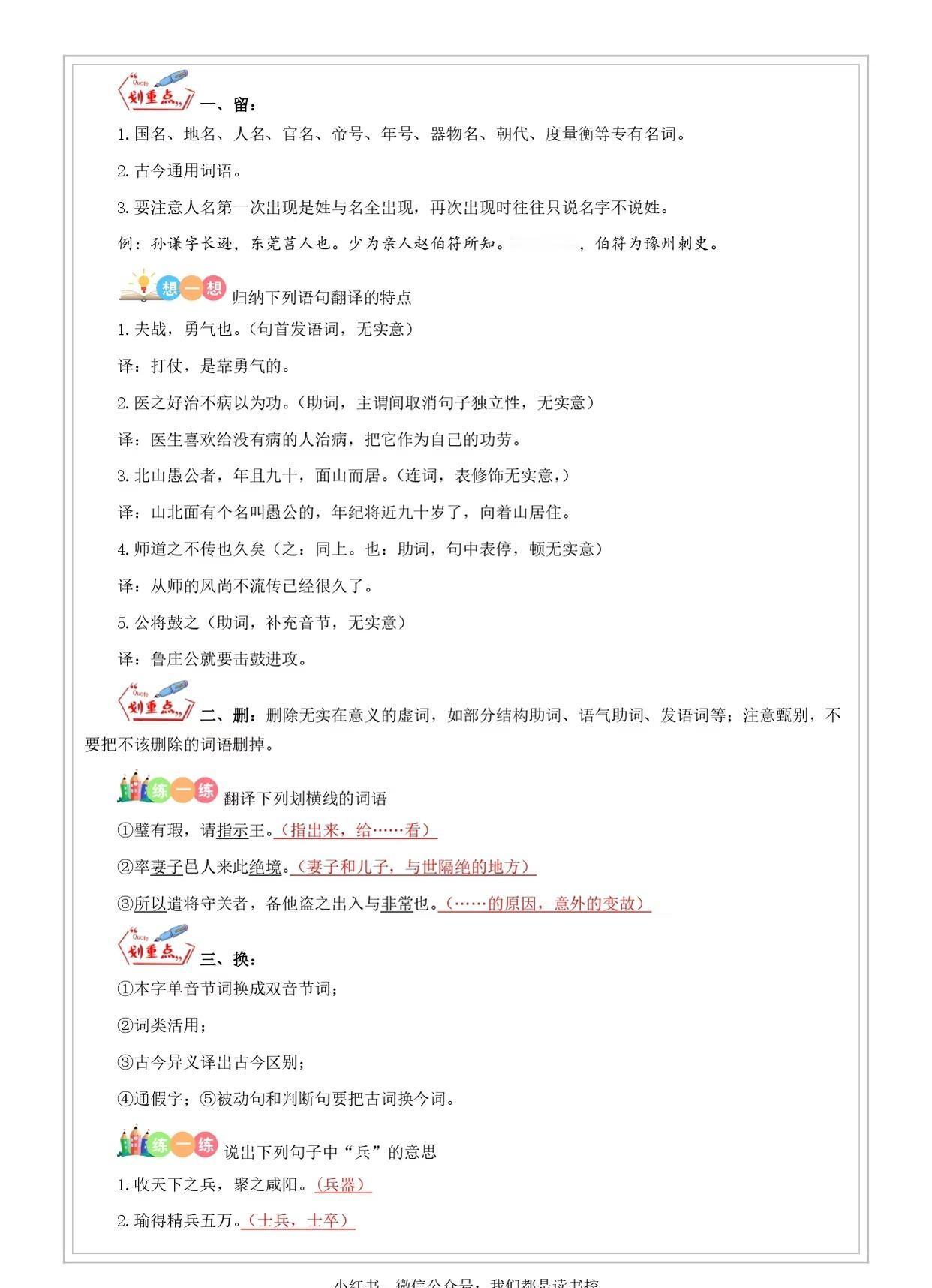 古文:文言文阅读之句式 一、词类活用 1.名词用作动词。 例:“雨雪霏霏”“天雨墙坏”。雨:下雨。 例“驴不胜怒,蹄之”。蹄:用蹄踢。 2.形容词用作动词。 例:“天下苦秦久矣”。苦:苦于,被压迫。 例:“吾妻之美我者,私我也”。美:认为……美。 3.名词作状语。 例:“群臣吏民能面刺寡人之过者”。 面:当面。 二、通假字 1.不亦说乎。“说”通“悦”,意思是:高兴。《论语·学而》 2路转溪桥忽见。“见”通“现”,意思是:显现,出现。《西江月》 3.食之不能尽其材。“食”通“饲”,意思是:喂养。《马说》 三、一词多义 (一)举 1. 抬:举头望明月,低头思故乡。(《静夜思》) 2. 发起,兴起:今亡亦死,举大计亦死。(《陈涉世家》) 3. 全:举世无双。 4. 提出:举一反三。 5. 任用:管夷吾举于士。(《生于忧患,死于安乐》) (二)道 1. 道路:会天大雨,道不通。(《陈涉世家》) 2. 道义:伐无道,诛暴秦。(《陈涉世家》) 3. 方法:策之不以其道。(《马说》) 4. 说:不足为外人道也。(《桃花源记》) 四、古今异义 1.词义扩大江河:古,专指长江和黄河;今,普通名词,成为河流的通名。 例:水由地中行,江、淮、河、汉是也。(《孟子·滕文公》) 2.词义缩小 臭:古,气味;今,只指难闻的气味。 例:左佩刀,右备容臭(xiù),烨(yè)然若神人。(《送东阳马生序》) 3.词义转移 闻:古,听,是听觉;今,一般指“嗅觉”。 例:我闻其声,不见其身。(《诗经》) 4.词义感情色彩的变化 爪牙:古,原指武臣或得力助手;今,指帮凶、狗腿子一类的坏人。 例:今阁下为王爪牙,为国藩(fān)垣(yuán)。(《与凤翔邢尚书书》) 5.其他常见古今异义词 举例“或”:古,有的。今,或者。例:或以为死,或以为亡。(《陈涉世家》) 小升初 中考 语文 古文