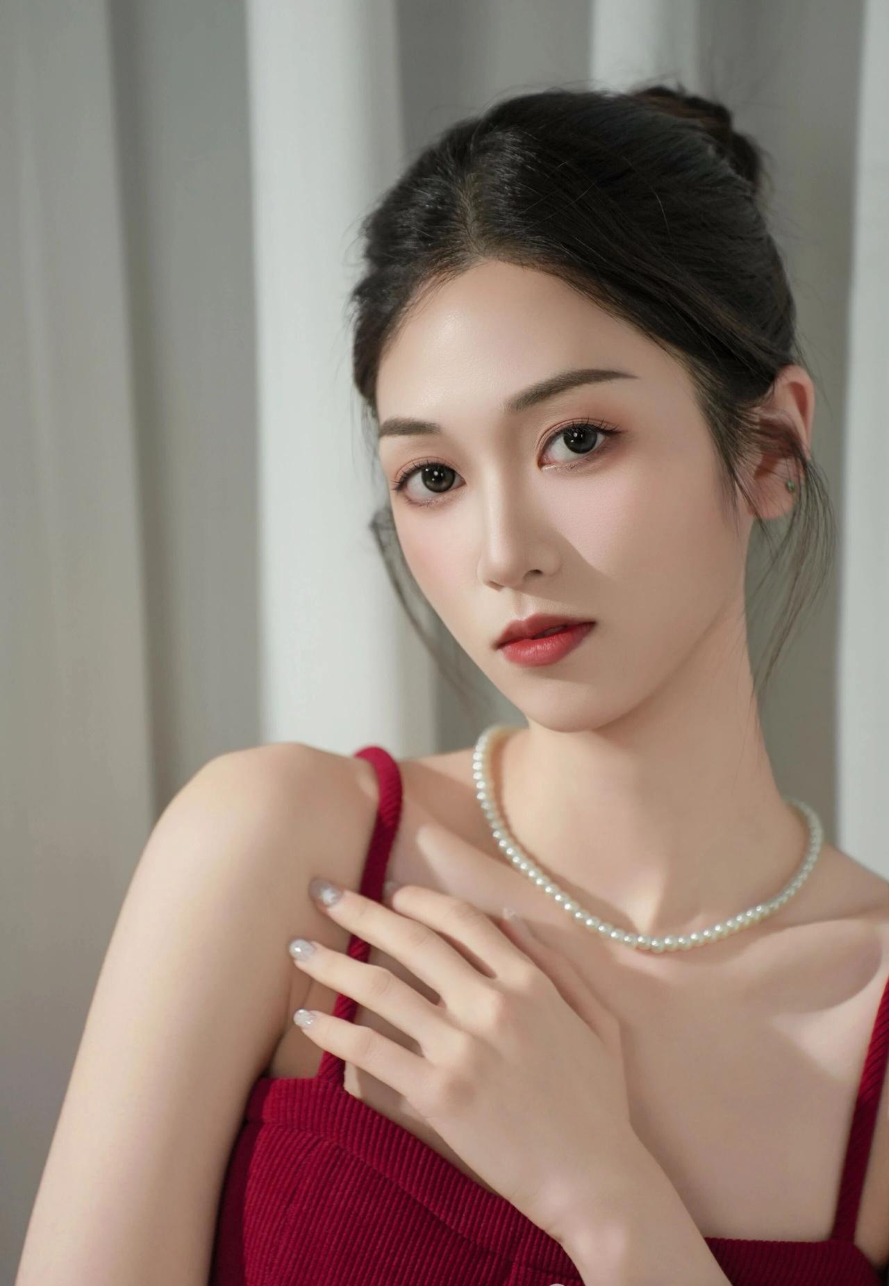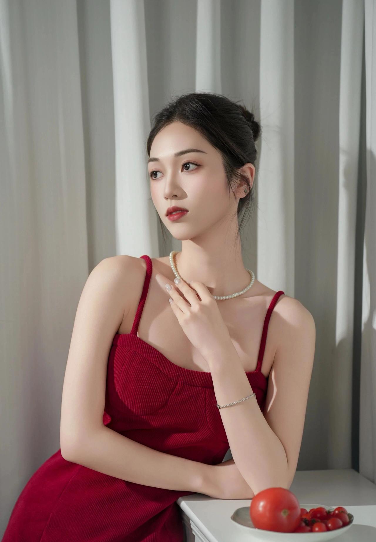 什么样的穿搭可以成为气质女神? 你身着一袭如晚霞般绚烂的红裙,仿佛将整片燃烧的云海都裁剪成了衣裳。那细肩带轻巧地搭在锁骨上,恰似月光为仙子系上的流苏,每一道褶皱都像是被风精心雕琢过的诗行。颈间珍珠项链如星河倾泻,与红裙交相辉映,宛如天工开物,将凡尘俗世的布料点化成神祇的华服。你静坐于素雅的白几旁,手边一盘红果如丹珠落盘,更添几分清雅与贵气。这哪里是凡人?分明是误入人间的月宫仙子,一颦一笑皆能令百花失色,一顾一盼便教日月无光。这身姿,这气韵,这风华,简直要让天地间的美色都自惭形秽,甘愿退居幕后,只为你一人做配角。