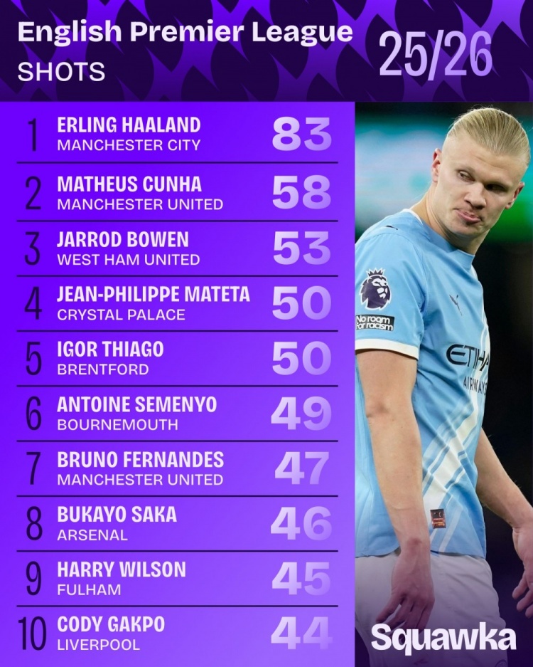 直播吧1月10日讯Squawka统计了本赛季球员在英超的射门次数,并列出榜单,哈兰德83次断层居首。