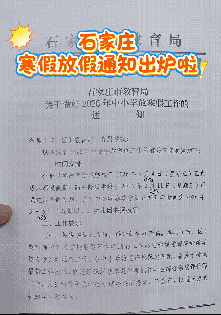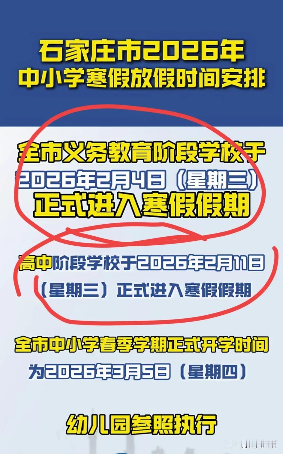 【官宣!邯郸寒假发布了吗?】石家庄寒假放假通知,已经官宣发布了! 昨天晚上10点左右发布了正式的消息!小学,初中学校于2026年2月4日,腊月十七,正式进入寒假假期!高中2026年2月11日也就是晚一个星期放假!春季开学时间为正月17开学,也就是2026年3月5日! 其实,每年的放假时间,基本上都是固定的!只不过是今年比较特殊一点!按照阳历,年前1月1几号才进去腊月!对于中考高考复习,有所变化!学校应该注意! 邯郸怎么还不发布呢?还需要千呼万唤始出来吗?真是咱们的大邯郸,大头在后边,姗姗来迟! 冬日生活打卡季 2026放假表 邯郸中小学放假 河北放寒假 信息图片来源网络侵权联删