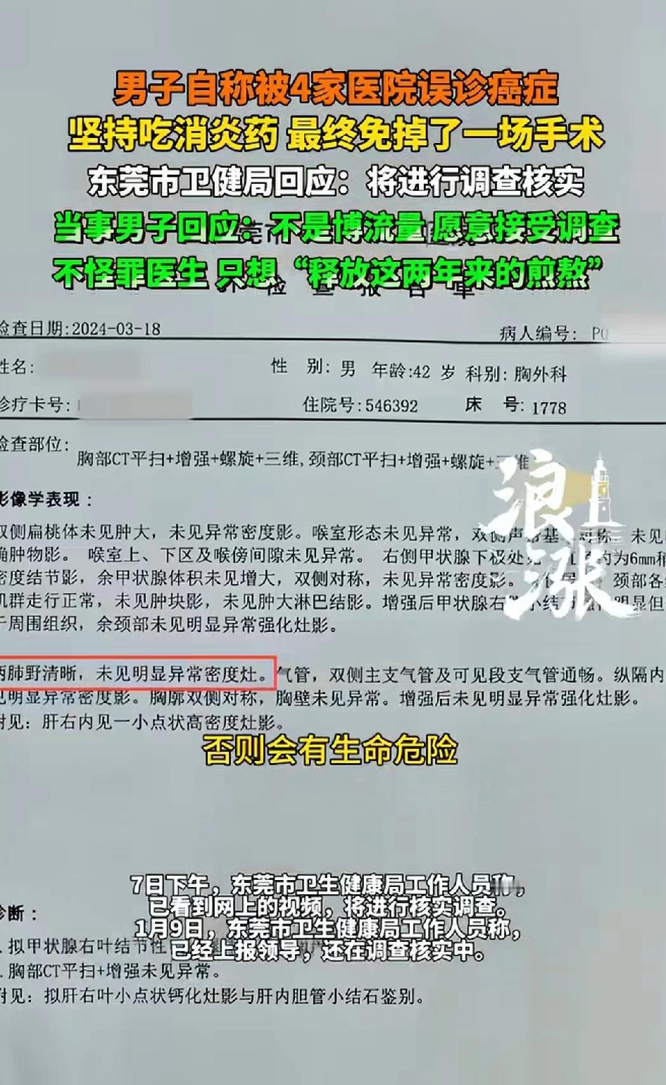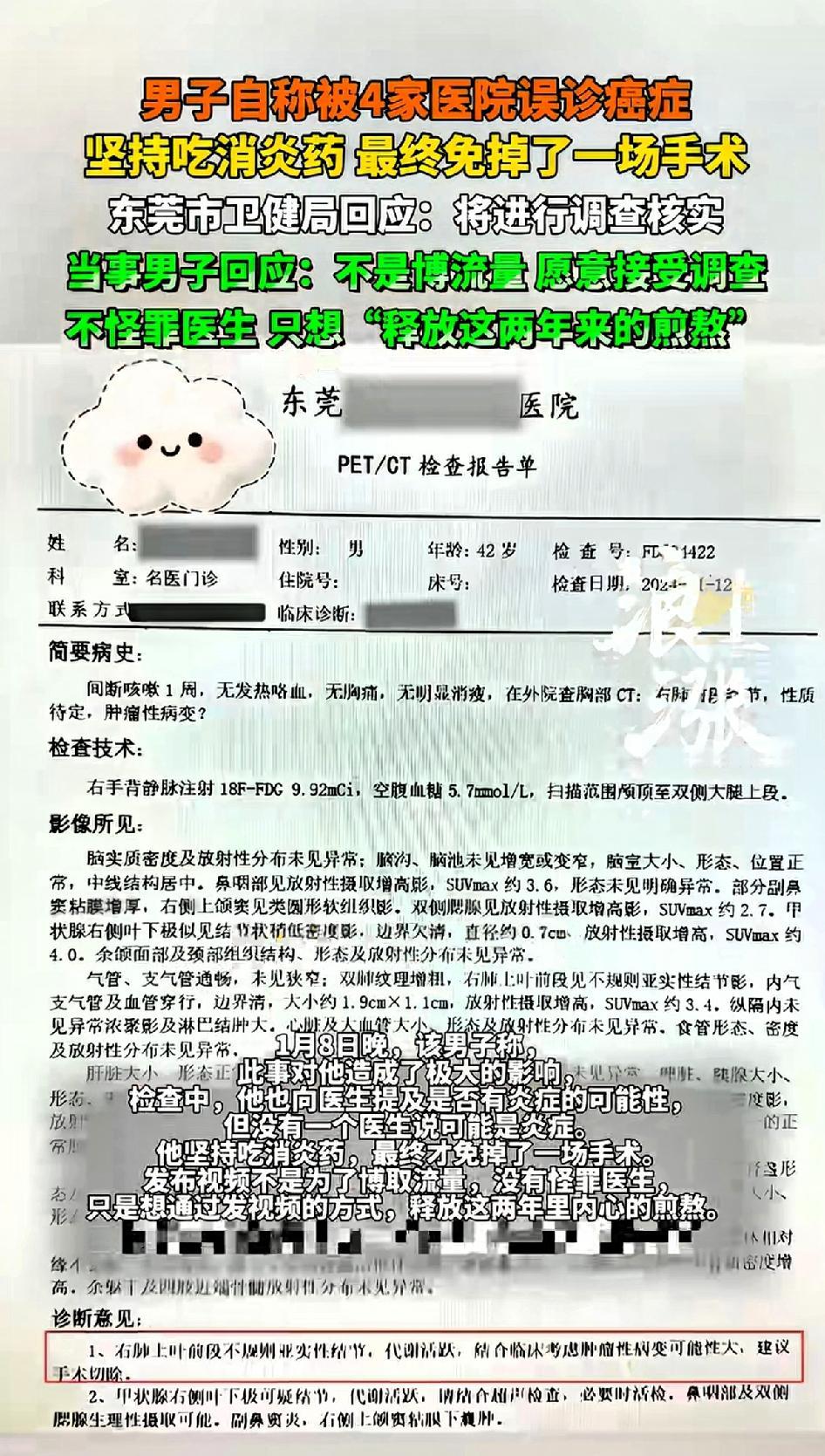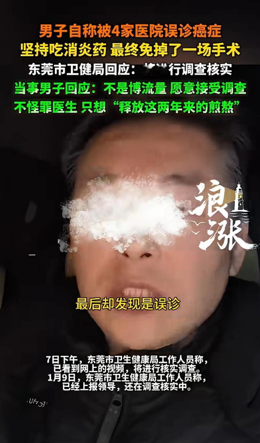 男子自称被四家医院误诊癌症,男子坚持吃消炎药,最终避免了一场手术。广东卫健局回应:将进行调查。 当事男子回应:不是博流量,愿意接受调查,不怪罪医生,只是想“释放”这两年的煎熬。 2025年12月26日,一男子发视频说自己2024年咳嗽去看病,先后被四家医院判定“恶性肺结节”,都得立马手术。 东莞两家医院这么说,武汉一家医院看了报告也这么说,他都准备在东莞第三家医院手术了。 结果手术前加强CT显示肺部“干干净净”。原来他一直坚持吃消炎药。 只是一些炎症,却被四家医院确诊癌症。事后男子还大度的表示不怪医生,想象一下一个中年男人,正是上有老下有小的年龄,突然被四家医院确诊癌症,这样的噩耗,对于他本人及其家人都是怎样的打击?两年来内心承受的煎熬,直到最后的误诊,男子表示不怪医生,我看纯粹是劫后余生的庆幸。 现在的人谈癌色变,一个被四家医生确诊癌症的人是怎么坚持下来的。眼看就要做手术了,幸好最后的一次加强CT和一个实习医生的提醒。才让男子避免了一次手术。 2026年1月7日,东莞卫健局表示要调查。这事儿要是真的,那误诊可太离谱了,男子要是直接手术,身体可就遭大罪了。希望调查能给大家一个真相,也让医疗更严谨些