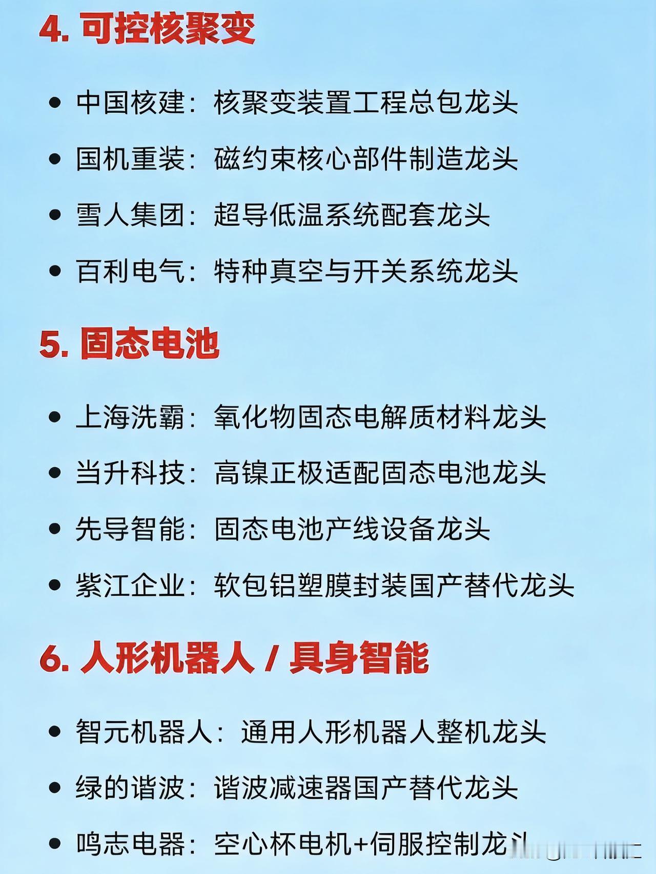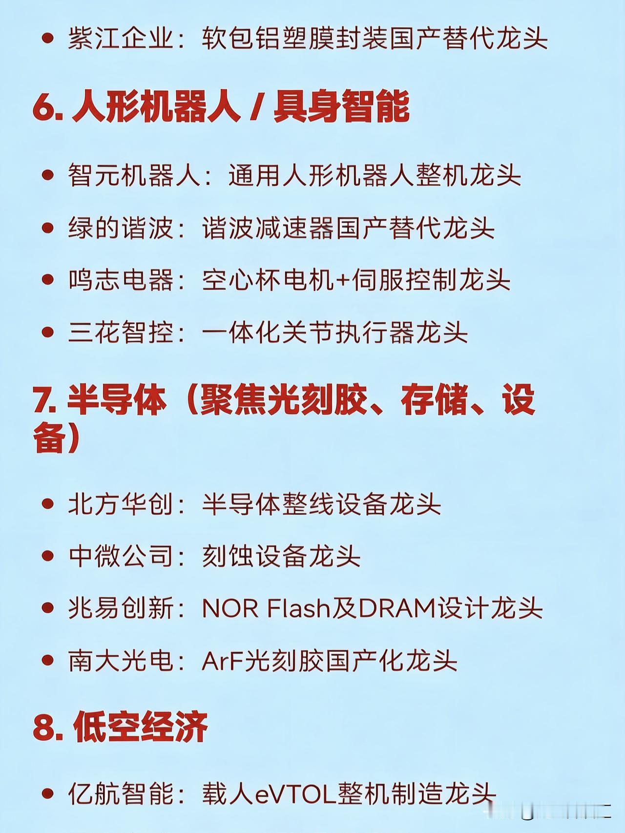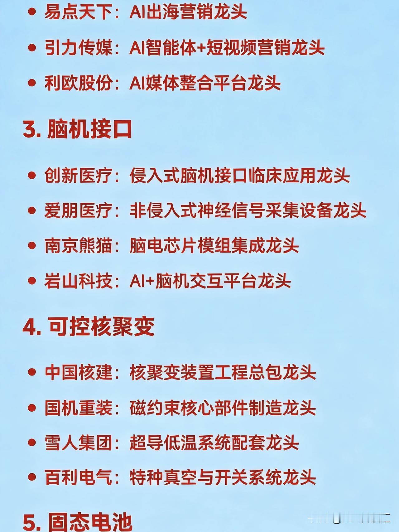本周(2026年1月第一周)十大热点 科技及其产业链核心龙头 1. 商业航天 中国卫星:卫星制造龙头 航天电子:航天电子元器件龙头 中国一重:重型火箭结构件/发射装备龙头 蓝箭航天:可回收液体火箭整机龙头 超捷股份:火箭紧固件与结构件龙头 中信海直:低空运营+起降场建设龙头 2. AI应用(含AIGC、Sora、Kimi、AI营销等) 蓝色光标:AI营销应用龙头 易点天下:AI出海营销龙头 引力传媒:AI智能体+短视频营销龙头 利欧股份:AI媒体整合平台龙头 3. 脑机接口 创新医疗:侵入式脑机接口临床应用龙头 爱朋医疗:非侵入式神经信号采集设备龙头 南京熊猫:脑电芯片模组集成龙头 岩山科技:AI+脑机交互平台龙头 4. 可控核聚变 中国核建:核聚变装置工程总包龙头 国机重装:磁约束核心部件制造龙头 雪人集团:超导低温系统配套龙头 百利电气:特种真空与开关系统龙头 5. 固态电池 上海洗霸:氧化物固态电解质材料龙头 当升科技:高镍正极适配固态电池龙头 先导智能:固态电池产线设备龙头 紫江企业:软包铝塑膜封装国产替代龙头 6. 人形机器人 / 具身智能 智元机器人:通用人形机器人整机龙头 绿的谐波:谐波减速器国产替代龙头 鸣志电器:空心杯电机+伺服控制龙头 三花智控:一体化关节执行器龙头 7. 半导体(聚焦光刻胶、存储、设备) 北方华创:半导体整线设备龙头 中微公司:刻蚀设备龙头 兆易创新:NOR Flash及DRAM设计龙头 南大光电:ArF光刻胶国产化龙头 8. 低空经济 亿航智能:载人eVTOL整机制造龙头 万丰奥威:eVTOL结构件龙头 莱斯信息:低空飞行管控系统龙头 中信海直:低空运营服务龙头 9. 数据要素 / 数据资产入表 人民网:内容数据确权龙头 易华录:地方数据交易所合作龙头 太极股份:政务数据库平台龙头 吉大正元:数据安全加密龙头 10. 小金属 & 战略资源 厦门钨业:稀土永磁+钨材料龙头 金钼股份:钼金属资源龙头 洛阳钼业:钴、铜、铌等战略金属龙头 中科磁业:高性能磁材龙头