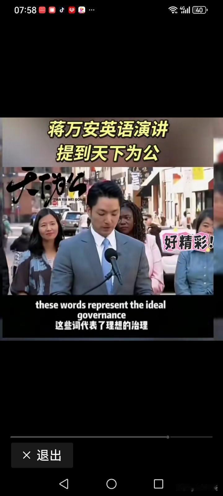 蒋万安在波士顿市政厅前的演讲中,将“天下为公”与孙中山理念关联,强调其体现人本治