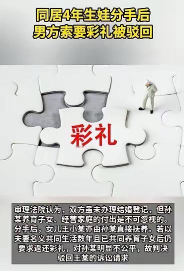男子经人介绍与女子相识,给付20万彩礼后,双方举办婚礼,开始同居生活,虽未登记结婚,却以夫妻名义生活4年,并且孕育1个女儿。随后,双方因家庭琐事分手,男子起诉要求返还全部彩礼,法院判了! 这事儿发生在2020年1月,王某和孙某经人介绍认识。为了结婚,王某给了孙某20万元彩礼。同年10月,两人按照老家习俗热热闹闹办了婚礼,之后便住在了一起。虽然没领结婚证,但周围邻居都把他们当正经夫妻看待。 2021年8月,家里添了个女儿,小日子过了四年。后来因为柴米油盐的琐事吵得不可开交,最终在2024年10月分道扬镳。孩子由孙某带着,王某越想越觉得亏,一纸诉状告到法院,要求前女友全额退还那20万彩礼。 法官认为两人虽然没登记结婚,却过了四年夫妻生活,还养大了孩子,已经算是事实上的婚姻了。孙某为这个家生儿育女和操持家务,她的付出理应被看到和认可。 最后法院驳回了王某的诉讼请求,四年朝夕相处生儿育女,早已超越了彩礼最初的意义,要是这样还能全额要回,对付出青春的一方太不公平了。 这事儿最近还被最高人民法院当作典型案件公布出来,最高法明确表示处理彩礼纠纷不能光看表面,得看有没有共同生活的经历,有没有生育孩子,彩礼的使用方式等。 两个人一起走过的岁月,为家庭倾注的心血,这些都不能用钱简单衡量。 各位读者你们怎么看?欢迎在评论区讨论。