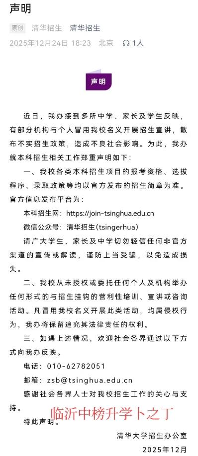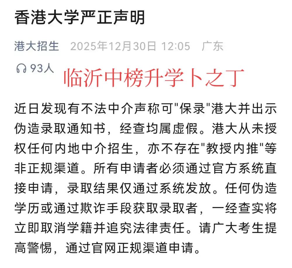 现在的骗子真多,有说能花钱安排工作的,有说能投资赚大钱的,有说能低分读名牌大学的,说的跟真事的一样,谎话连篇,乌烟瘴气!最近,北大、清华、港大等多所高校发声:都是骗局!其实,能够低分读名校的机会并不多,有外国户口的、艺术生、统招之外的中外合作办学是有机会的,不过这些渠道都是有门槛的,希望广大家长注意甄别,避免上当。欢迎大家留言文明交流!
