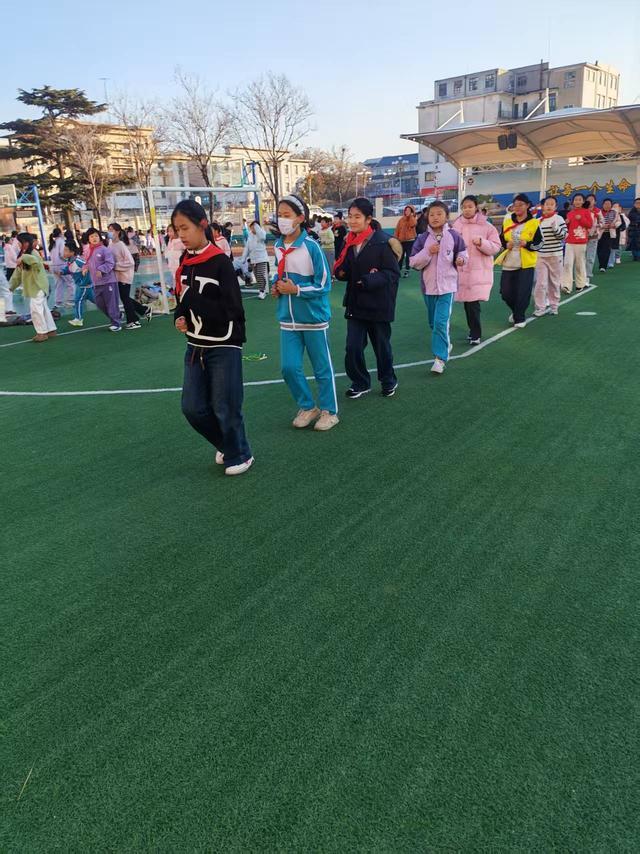 午后课间,面对跑道空间有限的小难题,同学们开启环形跑模式。大家排着有序的队伍,沿着跑道边缘慢跑前行,脚步声错落有致,宛如一串跳动的音符。小小的跑道上,洋溢着坚持不懈的体育精神。