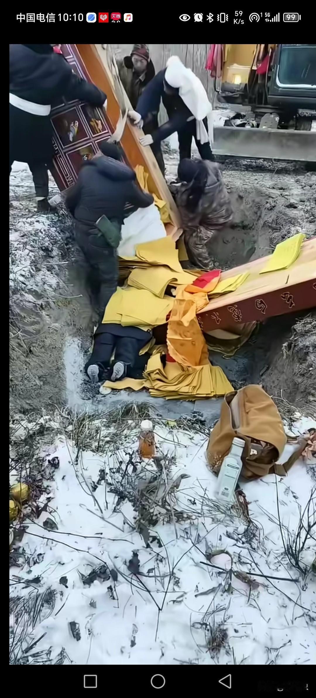 见棺发财,落棺失守。 谁的责任,人都掉出来了。 后人最难过,入土为安。 没想到多这环节。 动用挖掘机了。
