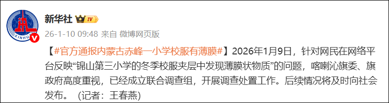 1月9日,喀喇沁旗教育局相关负责人称,正与市监部门在学校进行调研。视频显示的是冬季校服,这层膜叫覆膜面料,有质检报告,这种膜可能是保暖用的,正进一步调查此事。