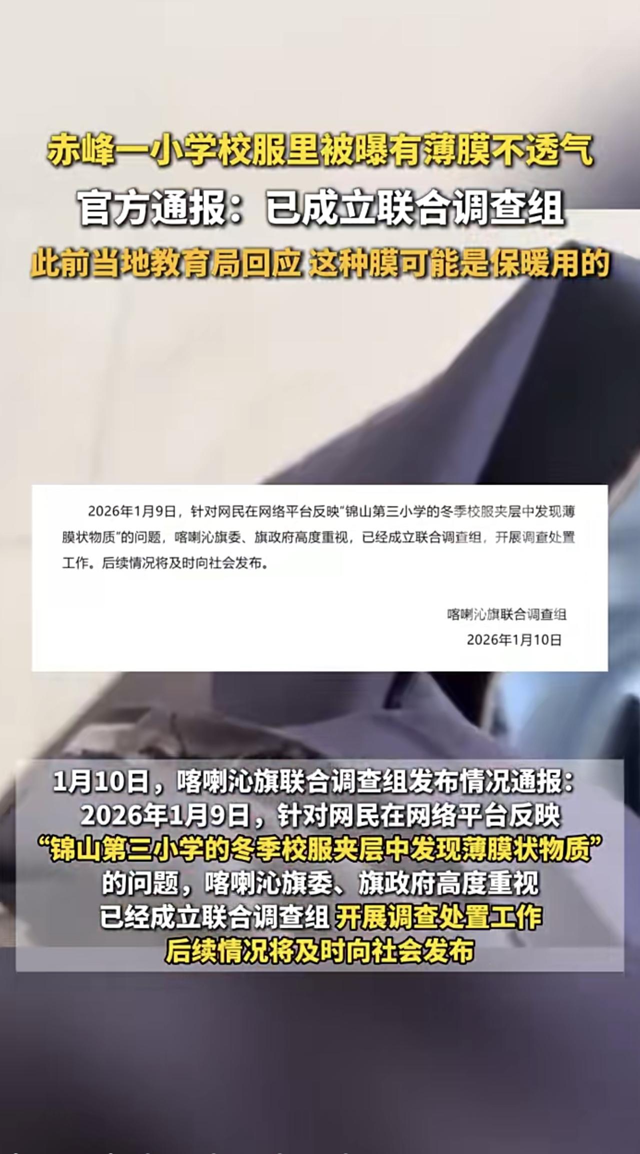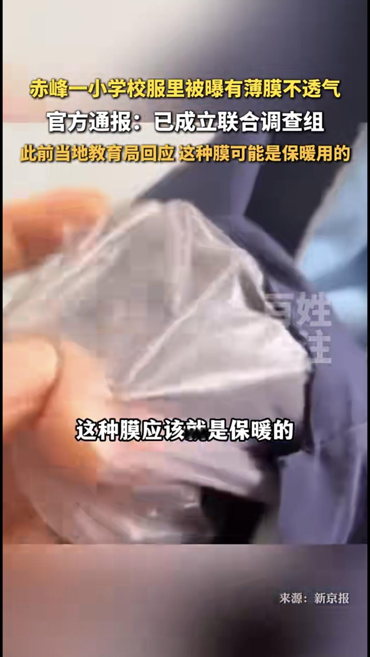 内蒙古赤峰一小学校服里有薄膜,官方通报!