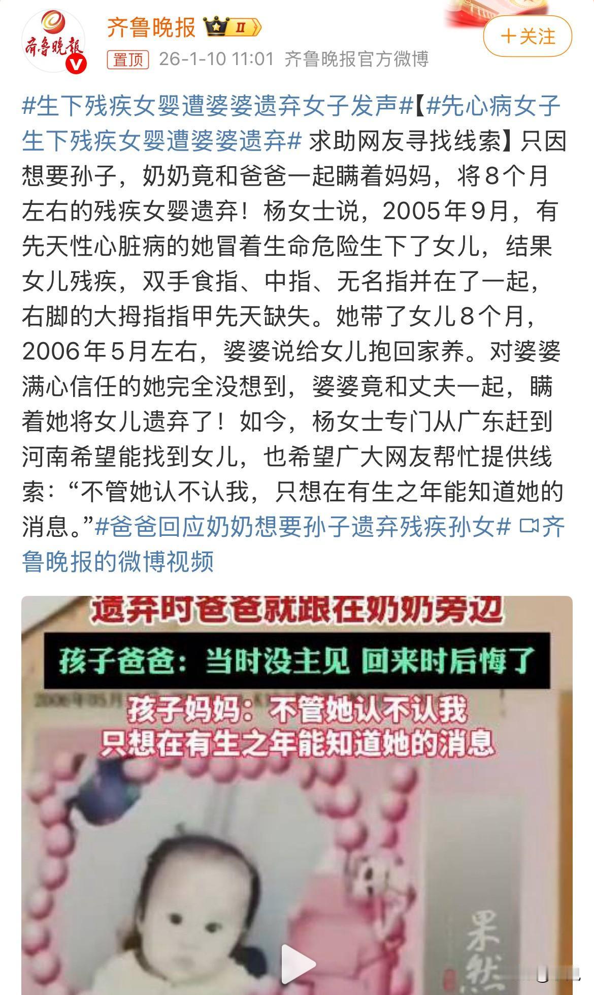 2006年5月,河南郑州一条普通的小巷里,一个8个月大的女婴被放下了。放下她的,是她的亲奶奶和亲爸爸。 被放下时,她的小手蜷着,食指、中指和无名指紧紧地并在一起;她的小脚上,右脚大拇指的指甲是天生缺失的。这个地点,离河南省高级人民法院很近。放下她的人,在之后的近二十年里,没有回头。 这个孩子的妈妈,杨女士,当时对此一无所知。 她正躺在广东的家里,因为先天性心脏病,生产几乎要了她的命。2005年9月,她拼了命生下的女儿,就是这样一个双手并指、脚趾残缺的孩子。但她爱她,带了整整八个月。婆婆当时说:“孩子我带回家养,你身体不好。”她信了,满心都是对老人的感激。 谁能想到,这是一场计划好的遗弃。婆婆和丈夫,趁她不在,把孩子从广东一路抱到千里之外的河南,丢在了那个陌生的小巷。然后回来,像什么都没发生一样,继续生活。 真相被隐瞒了将近二十年。杨女士年年问,年年得不到确切的回答。直到她崩溃,用最极端的方式“以死相逼”,婆婆才松了口。那句“丢在河南法院旁边了”,像刀子一样扎穿了她的人生。 更讽刺的是,当年参与遗弃的丈夫,如今出现在了镜头前。他承认,是“重男轻女思想洗脑”和经济压力,让他做出了这种事。他说他后悔,愿意协助寻亲。可女儿最需要父亲保护的二十年,已经永远地消失了,再也补不回来。 消息传开后,网上并非全是同情。有人冷冷地质问杨女士:“为什么当年不立刻报警?”“等了快二十年才找,是不是另有所图?”这些质问,站在旁观者的角度,轻松又锋利。但对于一个被至亲背叛、用了二十年才拼凑出真相的母亲来说,每一天的寻找和煎熬,都是外人无法称量的重量。 她现在什么都不图。她专门从广东赶到河南,一遍遍地走那条可能的小巷。她只说:“不管她认不认我,只想在有生之年能知道她的消息。” 那个被遗弃的女婴,如果活着,今年应该正好二十岁。她的双手和右脚,有着无法抹去的特征。她可能在一个普通的家庭长大,也可能经历了我们无法想象的坎坷。 一个孩子的命运,就这样被“想要孙子”的执念和父亲的懦弱,轻率地改写了。伤害来自最该保护她的人,这是整件事里,最让人窒息的部分。