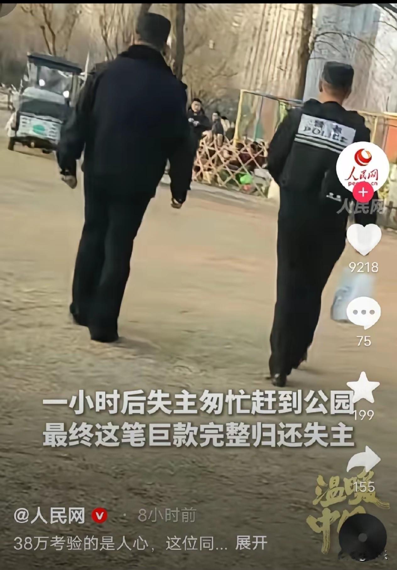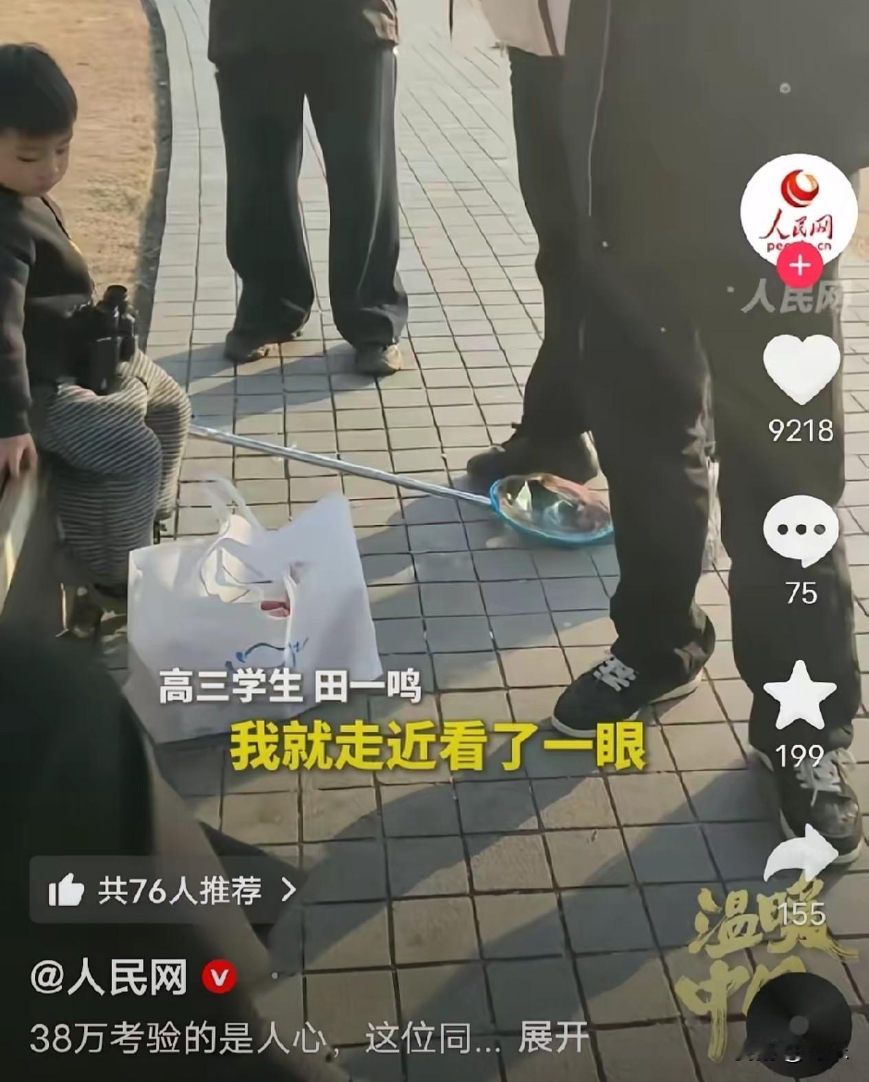 上人民网了!河南郑州,高三学生田一鸣在康平湖公园散步,一个塑料袋引起了他的注意。 凑近一看,吓得他赶紧询问旁边打羽毛球的女孩,确认不是她们的东西后,没丝毫犹豫就拨通了报警电话。 这片区根本没有监控,来往的人也不算多,围观的群众都忍不住议论:“就算拿几万块走,也没法查证”。 可田一鸣就蹲在长凳边,寸步不离地守着这袋钱,一等就是40多分钟,直到郑港派出所的民警赶到现场。 民警当场清点后,大家才惊掉下巴——里面竟有38万元,30万是整齐成捆的新钞,8万是散钞,全是刚从银行取出的真币。 更让人感动的是,田一鸣直到失主找来,才知道自己捡了这么大一笔钱。原来这笔钱是失主和女友刚取的订婚彩礼,和朋友游玩时不小心遗忘的,发现丢了后急得满头大汗。 这事上了新闻,田一鸣在学校得了表扬,失主还送锦旗道谢。很多人说,现在这样的年轻人不多了,他的诚实让人暖心。 拾金不昧的事其实不少。比如有报道说,清洁工捡到钱归还,司机送回乘客手机。普通人做的小事,加起来就是社会的温度。 诚信是做人根本。田一鸣的行为给同龄人做了榜样,说明品德比金钱重要。这种正能量能带动更多人,让社会更信任。 看法:田一鸣做得对。在没人看见时守住良心,最考验人品。社会应该多宣传这种好事,让诚信变成日常,大家都能过得踏实。