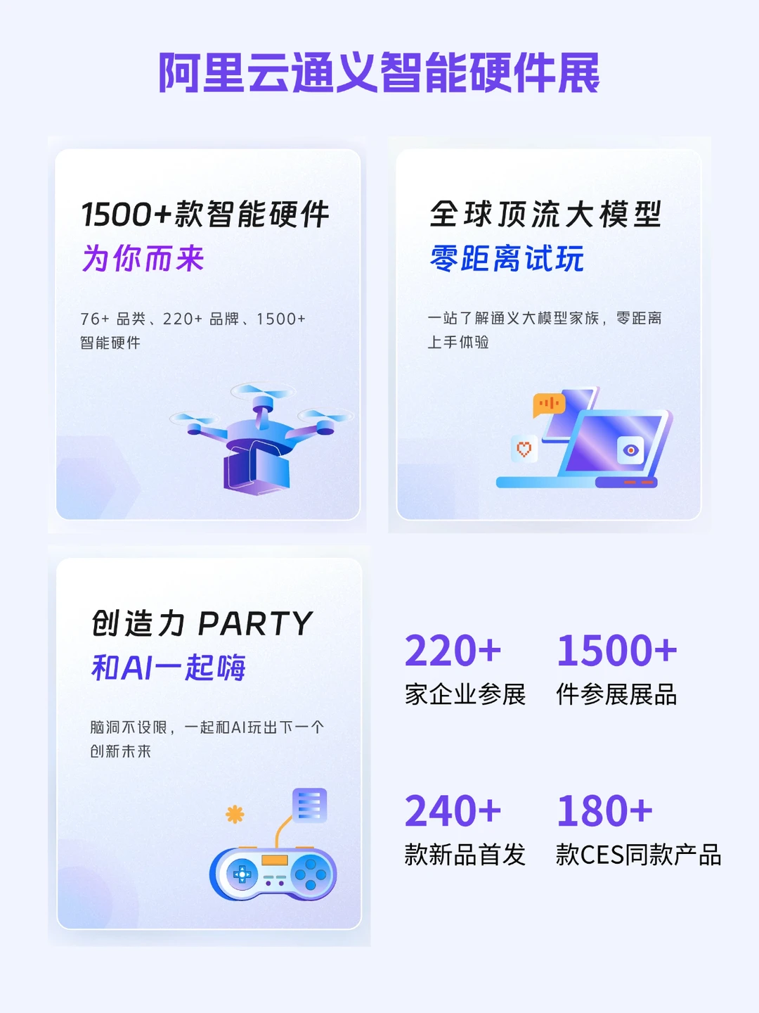 这次展会的规模相当之大,现场集结了220+企业、1500+硬件。尤为让人期待的是其中有240+款新品首次亮相,超180款美国CES展同款产品。现场所有展品都有阿里云通义系列大模型加持,那种智能交互的流畅感真的要亲自上手才能体会。