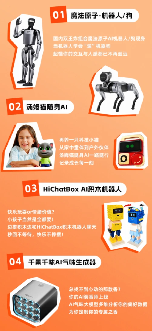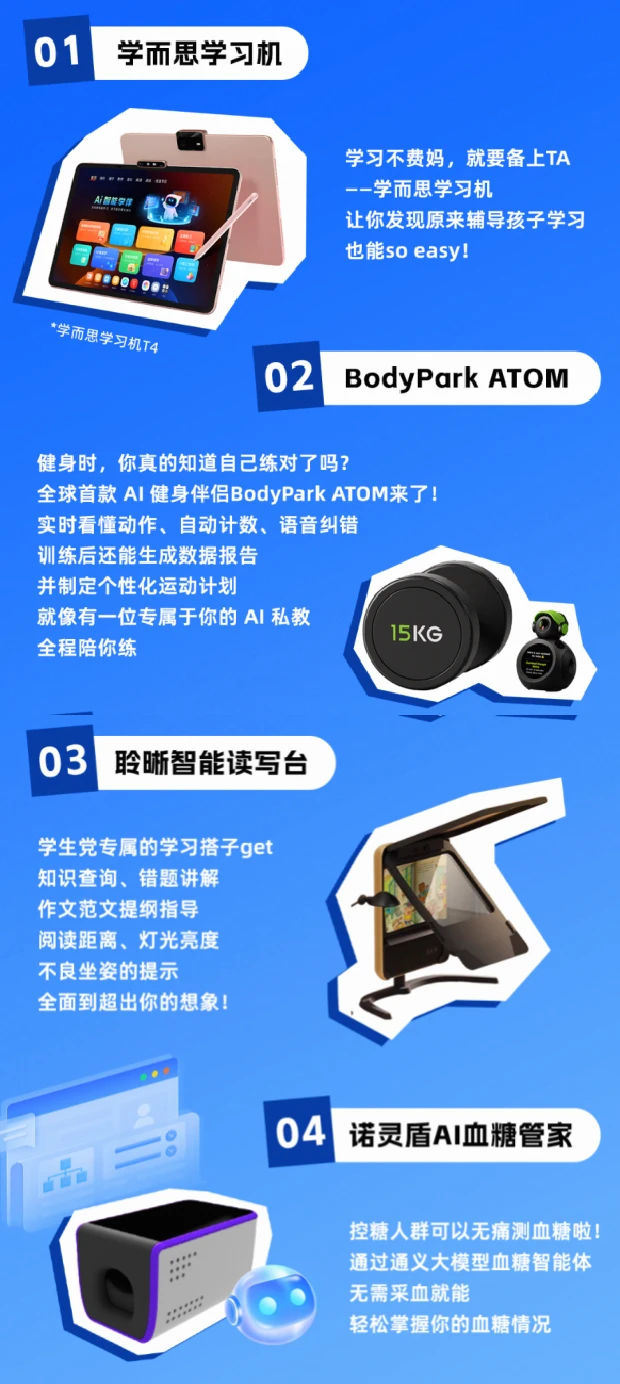 家里有老人小孩的朋友一定要去“幸福有AI”区域,看看温暖的AI陪伴好物。魔法原子机器人带着机器狗能全场景陪玩,汤姆猫随身AI还能记录孩子的成长时刻,日常陪伴超贴心。职场人学生党也有福利,“生活有AI”板块里的效率神器能帮你理顺节奏,学而思学习机轻松辅导孩子,BodyPark ATOM直接当你的专属AI健身私教,省心又高效。