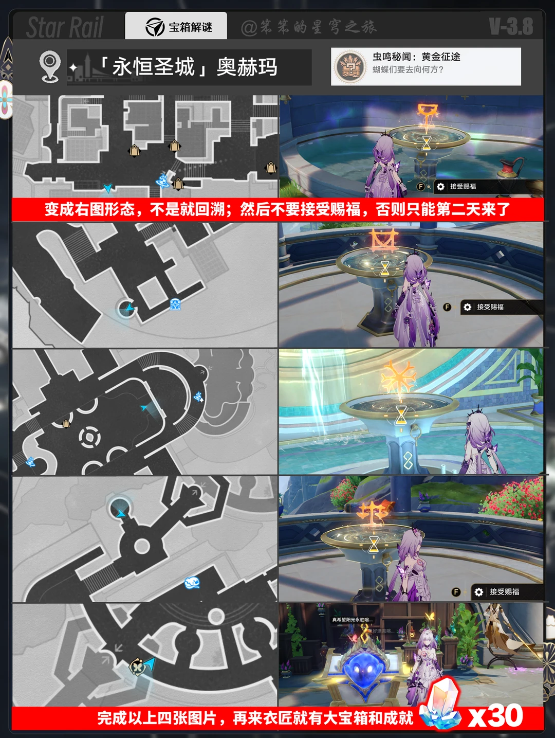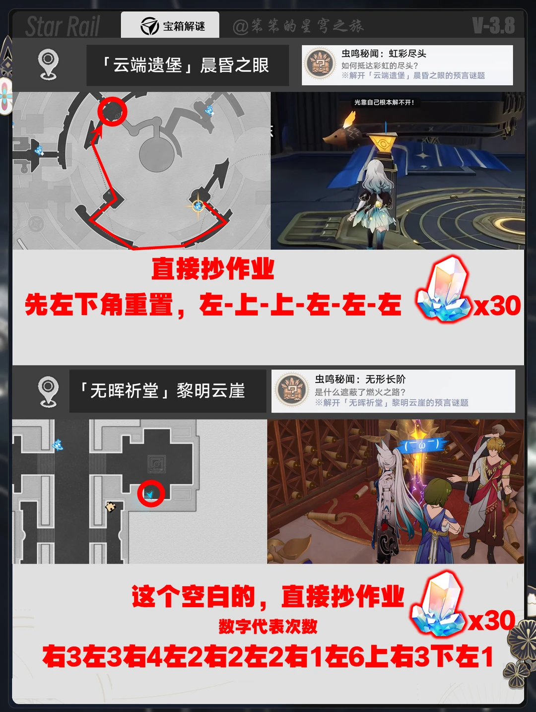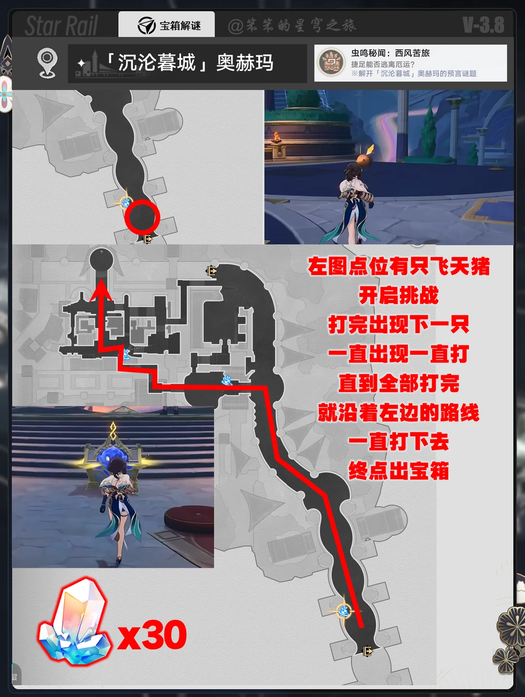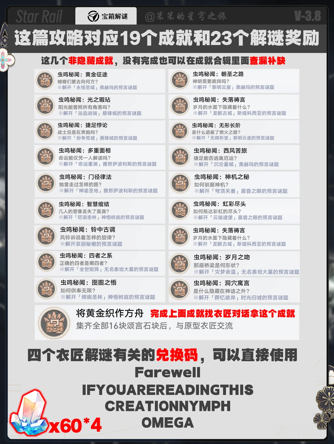 🐱大家好,我是笨笨的铲屎官 3.x翁法罗斯已经旅途结束了 进入4.x时代之前查漏补缺一下虫鸣秘闻吧 笨笨给大家整理了3.0-3.7 18个虫鸣秘闻 有18个成就和18个豪华宝箱 还有一个衣匠的总成就 其中还有四个单独星琼 可以直接使用 萌新开拓者可以直接抄作业 一次性拿下近1000星琼 没全部拿下的去查漏补缺一下吧