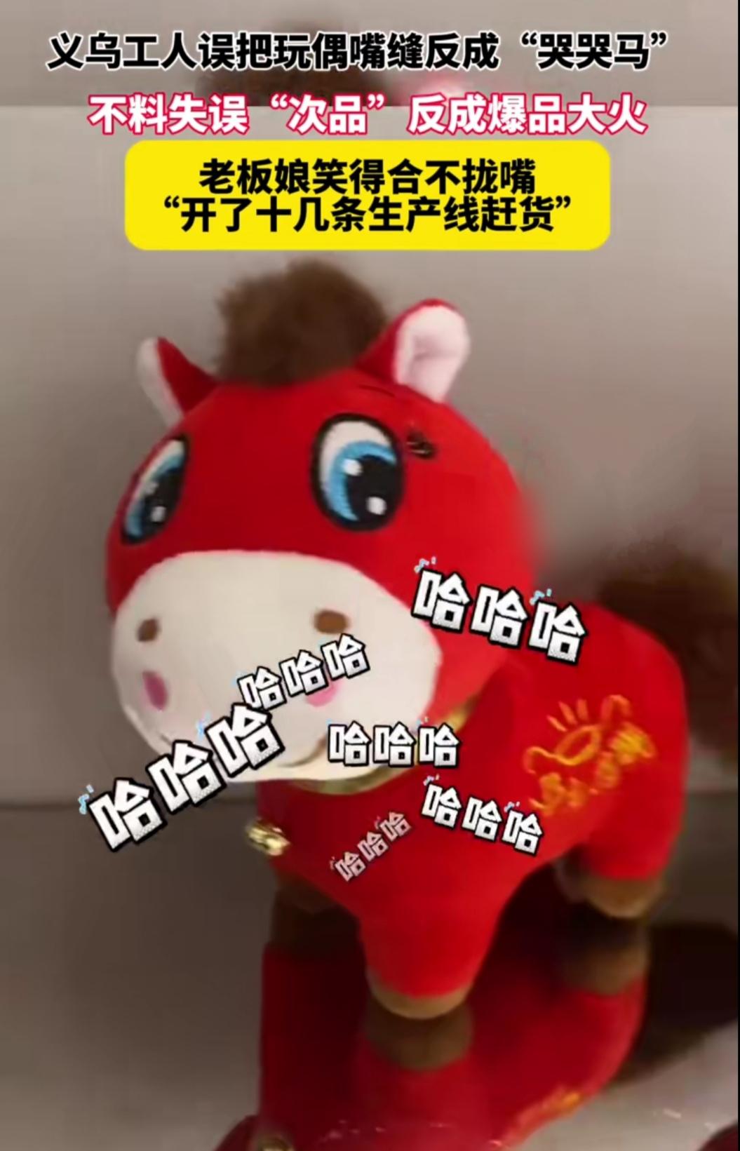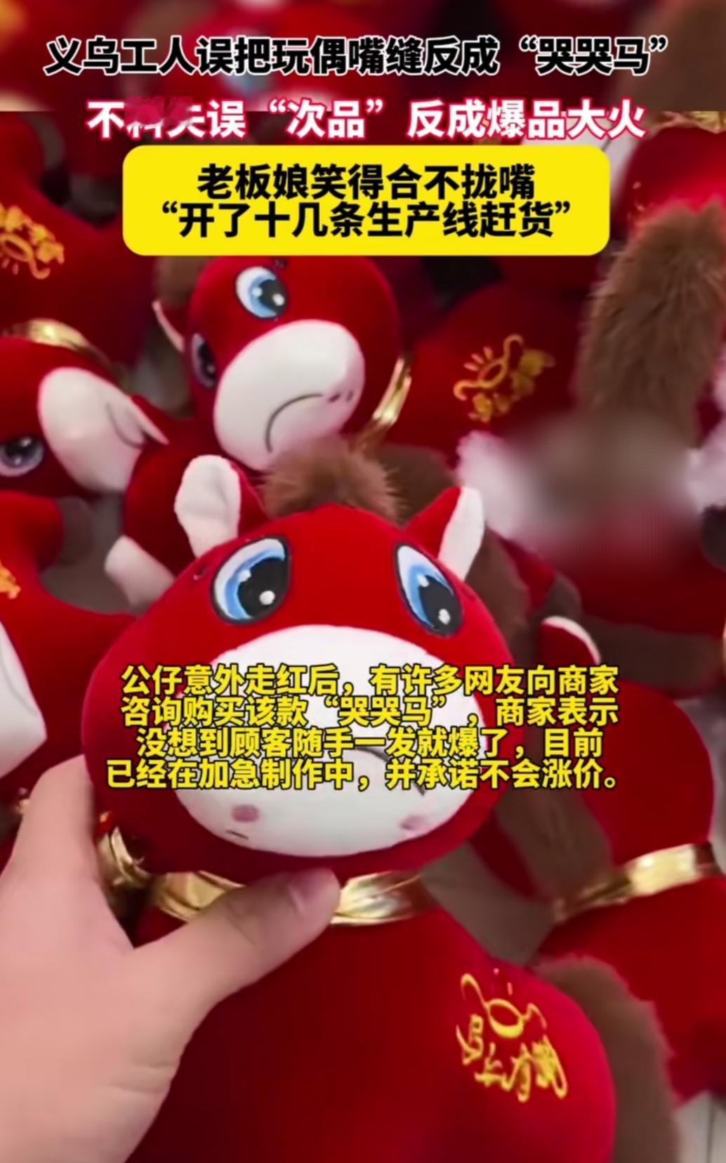 谁能想到!义乌老板娘随手一批货,居然因为工人一个“失误”爆火全网?这只缝反嘴的“哭哭马”,凭委屈巴巴的模样圈粉无数,网友直呼“越看越上头”! 其实这事儿真挺奇妙的,本来是要做咧嘴笑的玩偶,结果缝线出错变成了耷拉着嘴的“委屈脸”。没成想就是这份意外的“小遗憾”,戳中了当代人的共情点——谁还没个emo时刻,这匹马简直是嘴替本替! 更有意思的是,老板娘都没料到会爆单,原本可能要返工的“残次品”,反倒成了断货王。网友们一边疯狂下单,一边调侃“失误造就经典”。有时候生活就是这样,无心插柳的意外,反而能碰撞出不一样的惊喜,你觉得呢?