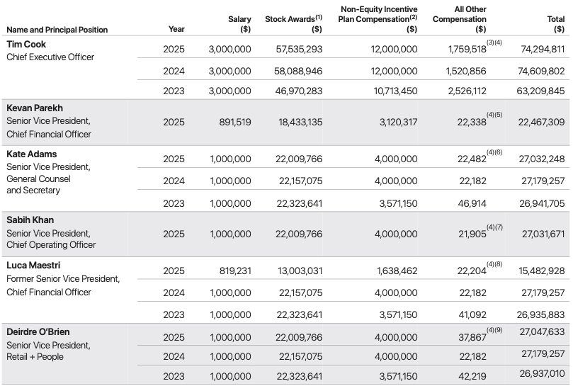 当地时间1月8日,苹果公司在提交给美国证监会(SEC)的文件中披露,库克2025年总薪酬为7430万美元,较2024年的7460万美元小幅回落,但仍超公司设定的5900万美元目标,核心得益于苹果2025年的良好业绩表现。另外,该公司将于美西时间2026年2月24日举行线上年度股东大会。