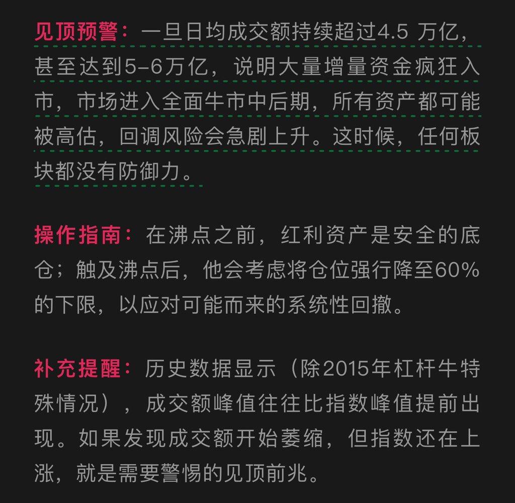 A股开年狂飙!沪指16连阳站上4100点,成交额飙破3万亿! 2026年第一周,A股上证指数豪取16连阳,1月9日收盘4120.43点,时隔10年重返4100点上方,创2015年7月以来新高!全市场超3900只个股飘红,连续两天超百股涨停,赚钱效应拉满!成交额更猛,1月9日全市场3.15万亿元,沪深北合计突破3万亿,时隔几个月再次站上这一历史级别天量! 开年首周日均成交额已轻松站稳2.8万亿以上,资金面超级活跃,增量资金疯狂涌入! 有人认为见顶预警亮起,但经典指标成交额显示还有空间。根据以往经验,成交额达到全部市值的4%的比例情况下,预示行情接近见顶。按照当前总市值110万亿估算,一旦日均成交额持续超过4.5万亿甚至冲向5-6万亿,市场就进入全面牛市中后期,所有资产都可能被高估,回调风险急剧放大,几乎所有板块都失去防御力! 目前量能虽已极强,但还未到极端沸点。历史经验显示成交额峰值往往提前于指数峰值,一旦量缩价涨,就是见顶前兆。当前操作建议考虑把红利+高股息+低估值权重仍作为安全底仓,短期继续享受进攻性红利! 一旦触及日均超4.5万亿以上这个沸点,建议果断降仓至60%以下,严防系统性回撤! 春季攻势才刚开始,AI应用、商业航天、可控核聚变等热门赛道火力全开。但也别忘记:牛市最疯狂的时候,往往也是风险最高的时候!