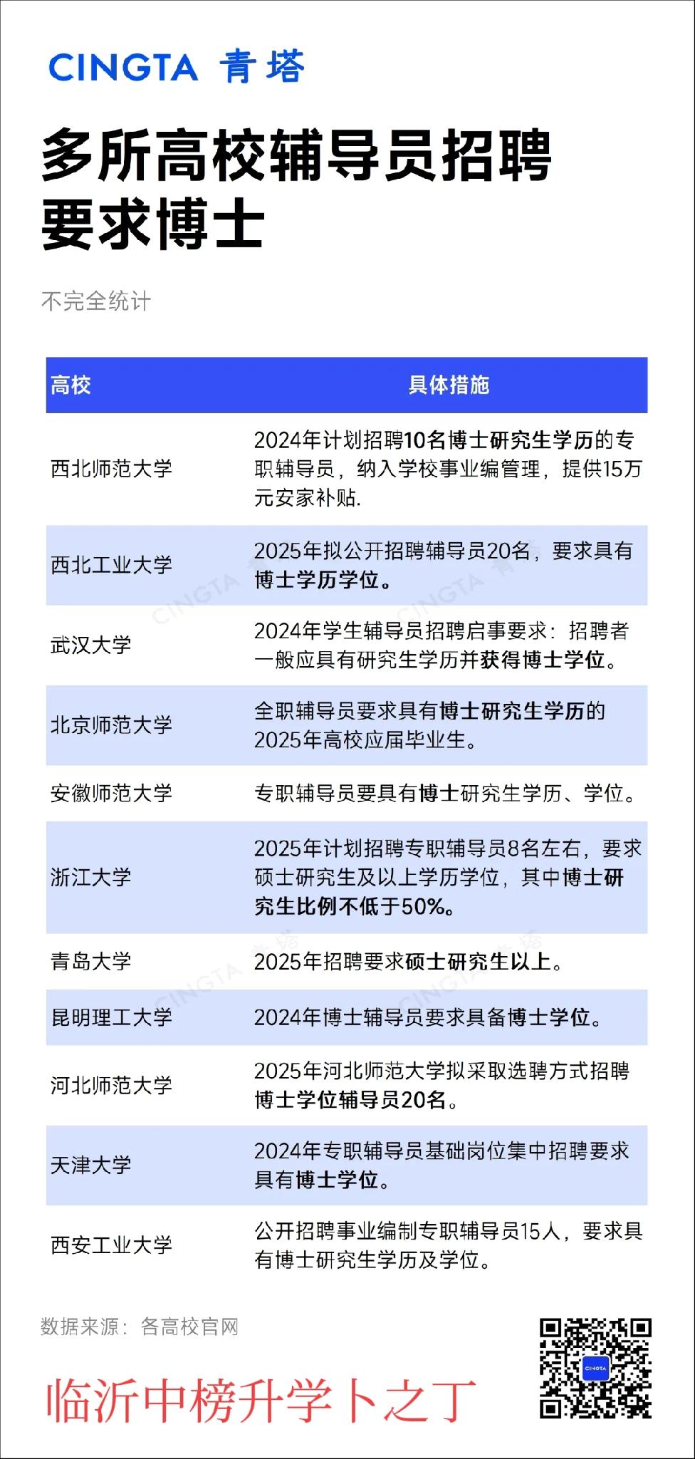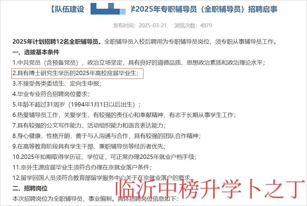 当在是本科学历贬值,过几年是硕士研究生学历贬值,那么博士研究生学历什么时候贬值呢?其实,博士研究生学历贬值已经到来了。2025年,某师范大学发布专职辅导员招聘启事,选拔基本条件之一是“具有博士研究生学历的2025年高校应届毕业生”。也就是说,以后大多数高校招辅导员也得是博士研究生学历了。欢迎大家留言文明交流!