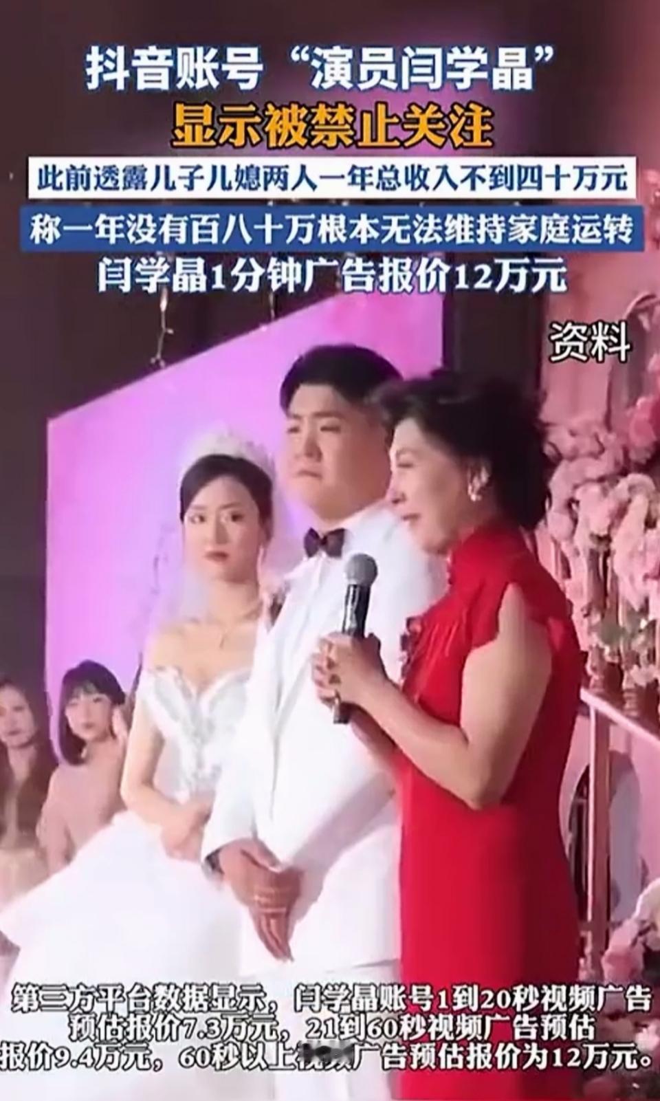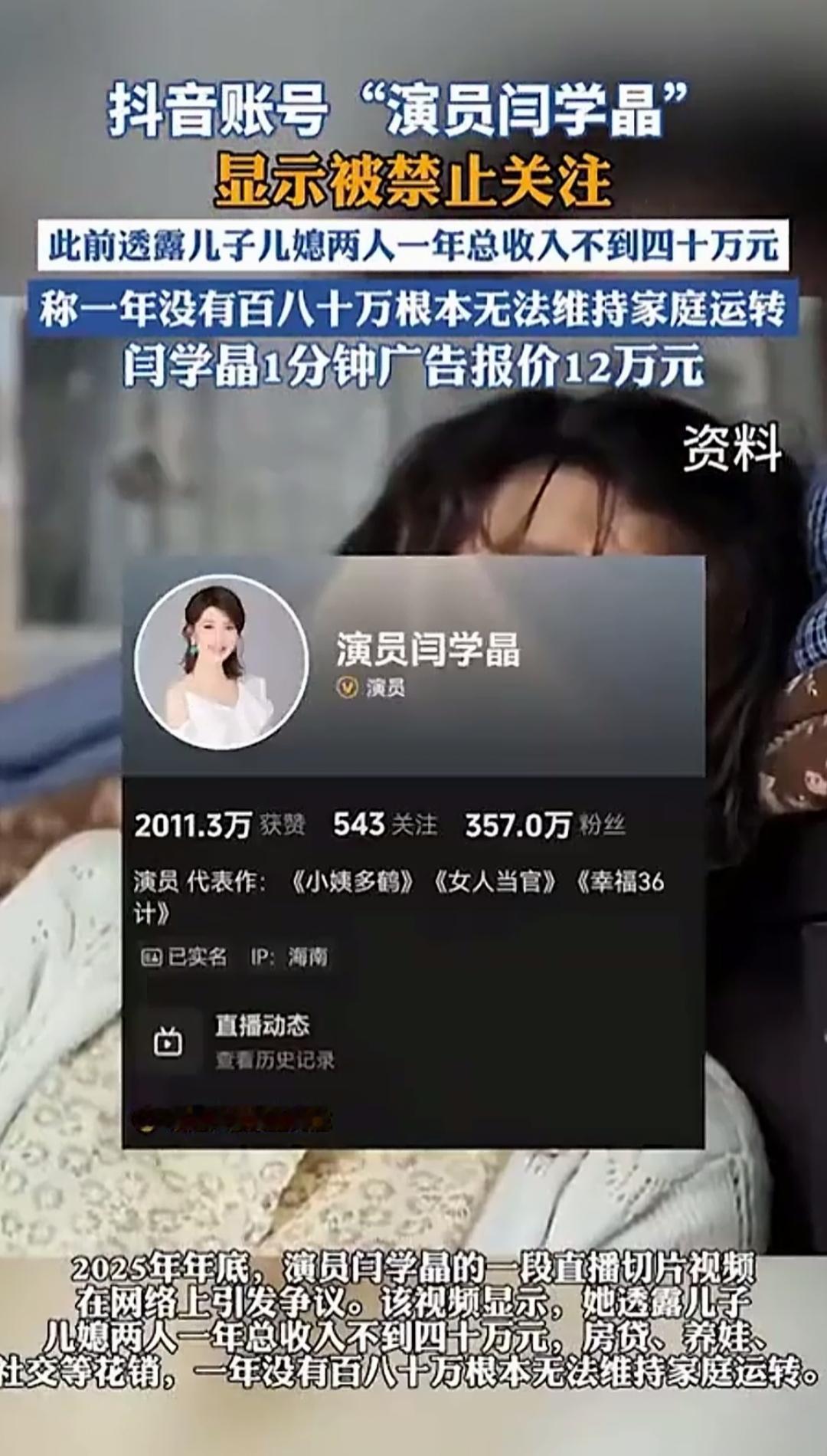 谁能想到,演了一辈子接地气角色的闫学晶,账号突然被标“禁止关注”——粉丝刷到这页时,第一反应全是“会不会和她之前那番话有关?” 之前她直播说,儿子儿媳一年挣不到四十万,可房贷养娃加社交,没百八十万根本撑不起家;转头第三方数据曝她1分钟广告就报价12万,20秒的广告都能拿7.3万。这话当时就让不少人嘀咕:普通家庭四十万够攒好几年了。 现在账号突然受限,平台没说明、本人没回应。有人猜是争议发酵,也有人觉得是系统误判。这事儿到底和之前的“开销论”有没有关系?你觉得这反差算啥情况?评论区聊聊~