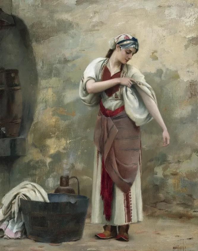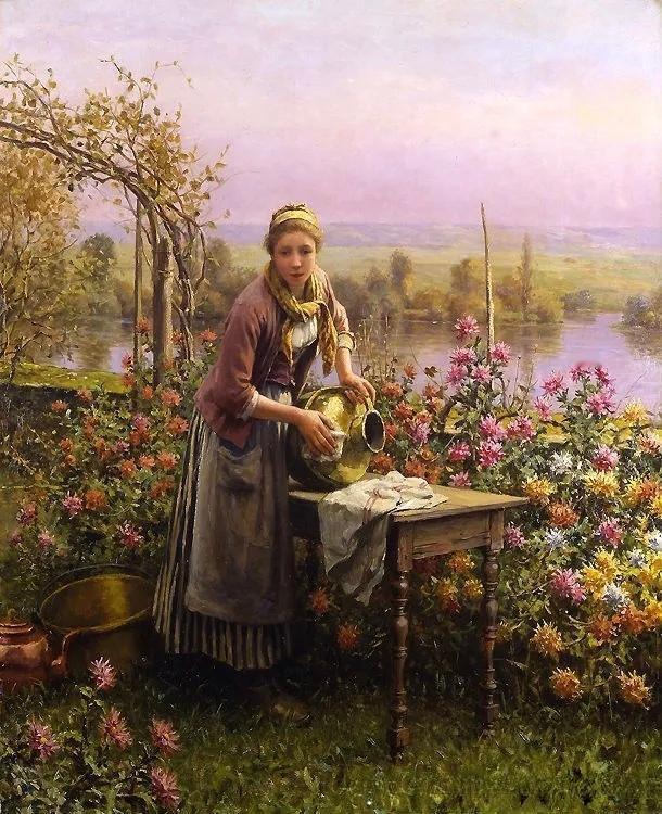 田园少女静坐花丛,悠然自得,远眺村庄,岁月静好。