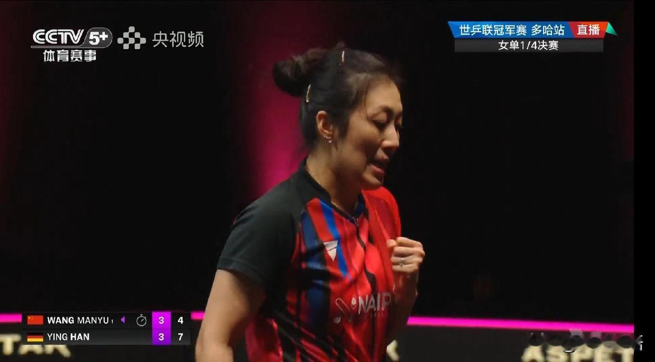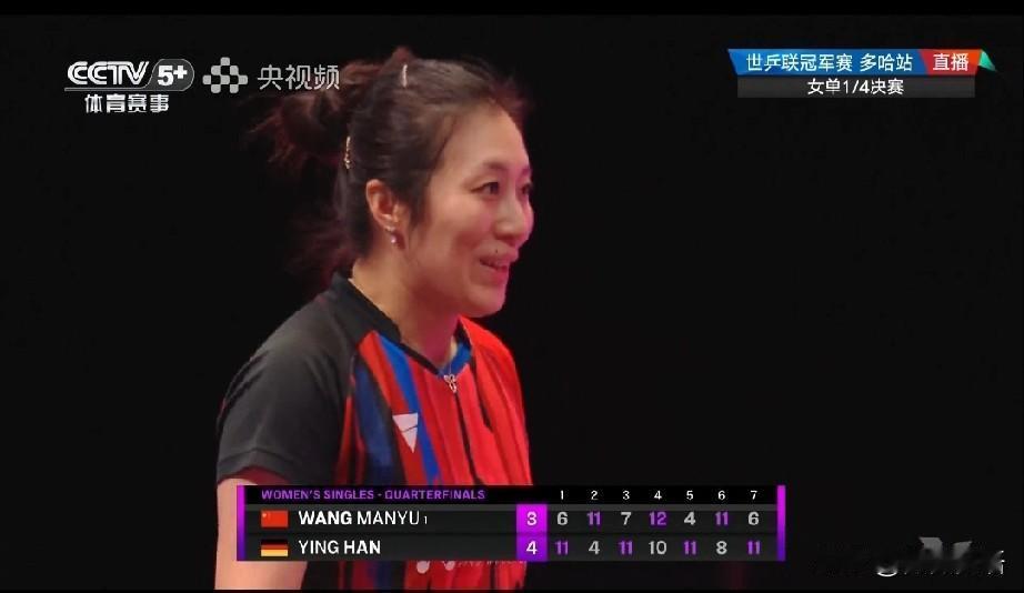 韩莹赢下比赛后,笑的很开心。 这是她第一次打进WTT冠军赛的女单四强,而且还是首次赢了王曼昱,韩莹这次比赛的状态确实好,这样看陈熠上一轮输给韩莹也不是偶然的,韩莹这段时间恢复的不错。 打削球是真的费体力,看到打到决胜局时两个人都累了,看得出来韩莹非常想赢下这场比赛,出手很坚定,在决胜局韩莹比分领先后,心态就不一样了。最终韩莹是4-3战胜了王曼昱,比分:6-11,11-4,7-11,12-10,4-11,11-8,6-11。韩莹晋级女单4强,明天的半决赛韩莹将对阵朱雨玲,这一场比赛肯定也会精彩,估计赛前朱雨玲是重点备战王曼昱了,没想到韩莹今晚赢了。 不过今天看到朱雨玲赢了大迪,韩莹赢了王曼昱,不得不感叹老将在比赛场上想赢的那颗心,她们的体育精神让人敬佩。也希望我们的队员们能好好休息,他们也是一直参加比赛,身心都很累,今晚的比赛可以看得出王曼昱的疲惫,接下来好好休息休息,备战下个月的亚洲杯吧,下个赛场见!