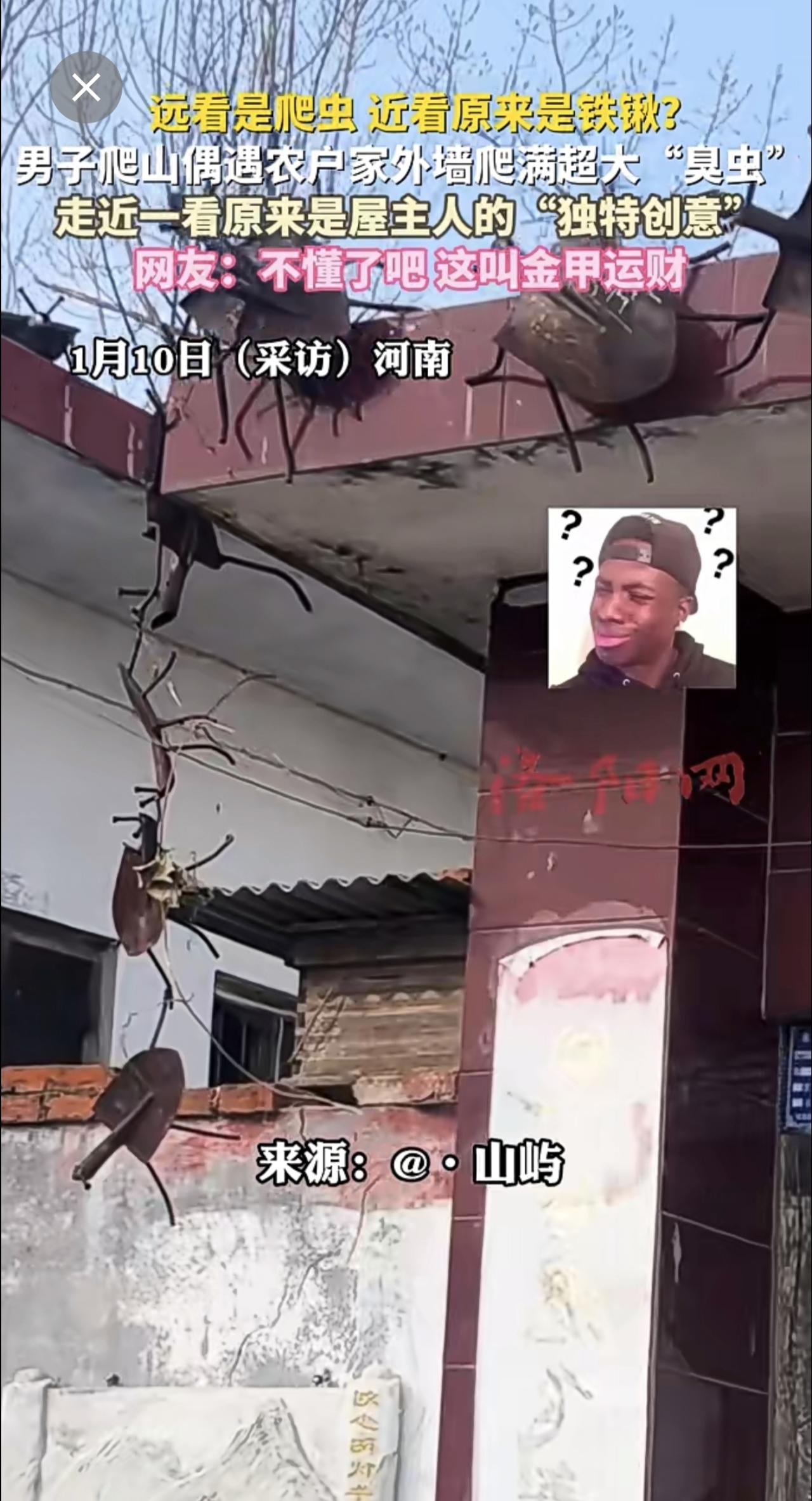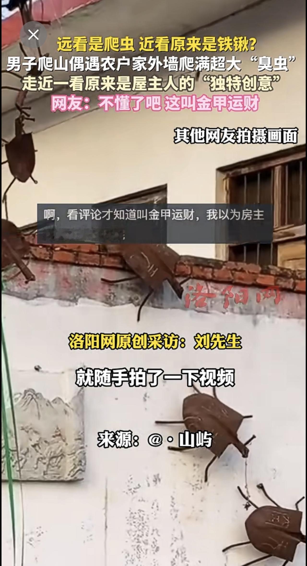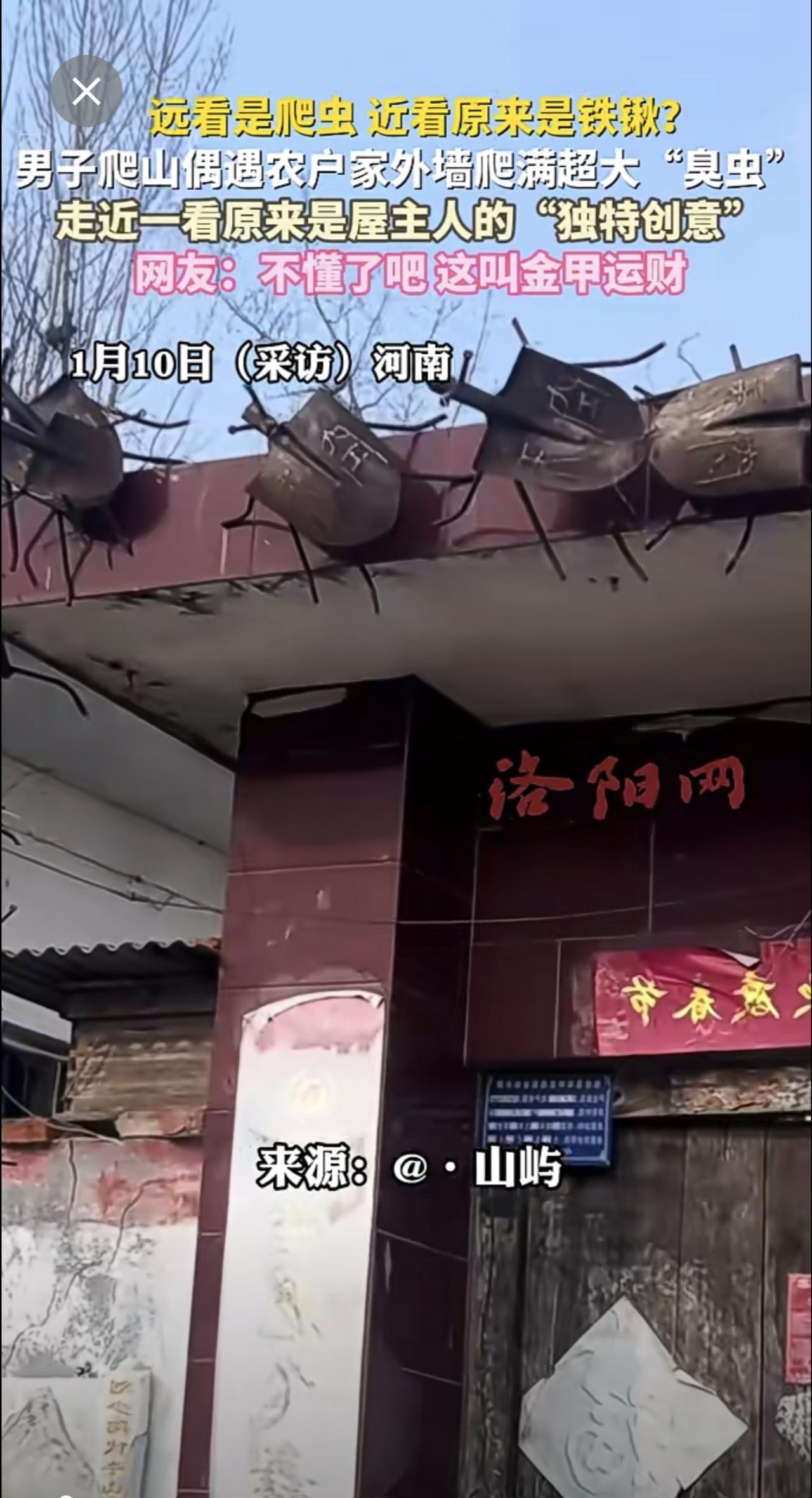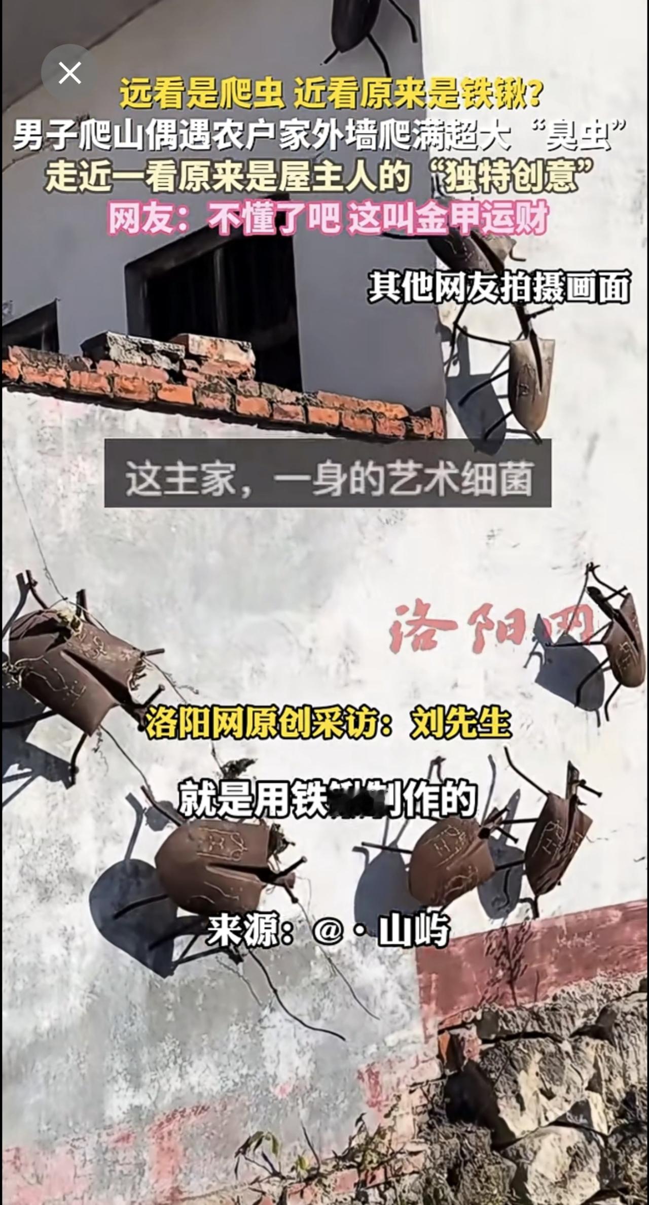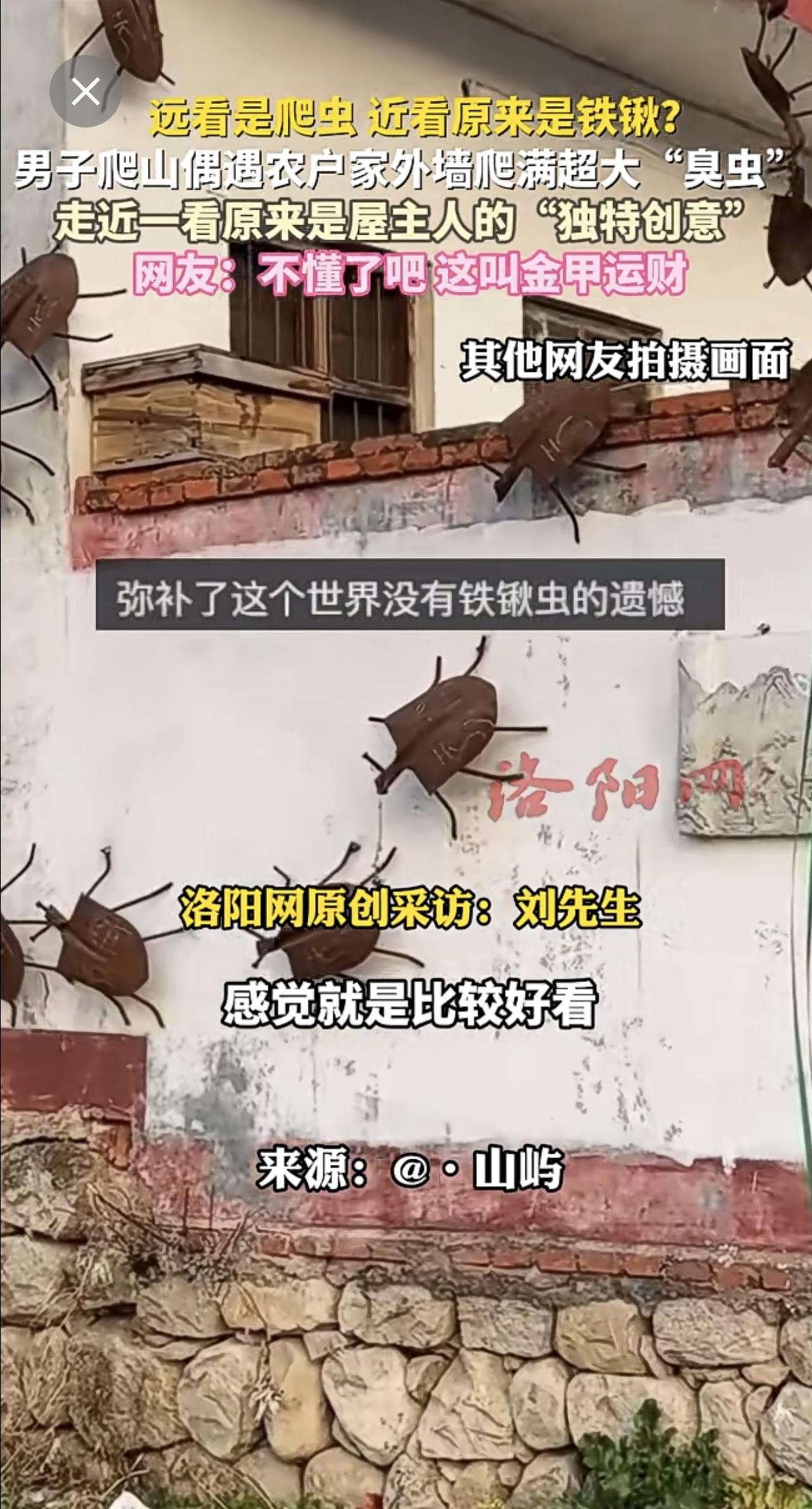 远看是爬虫,近看原来是铁锹?男子爬山偶遇农户家外墙爬满超大“臭虫”,走近一看原来是屋主人的“独特创意”,网友:不懂了吧,这叫金甲运财。