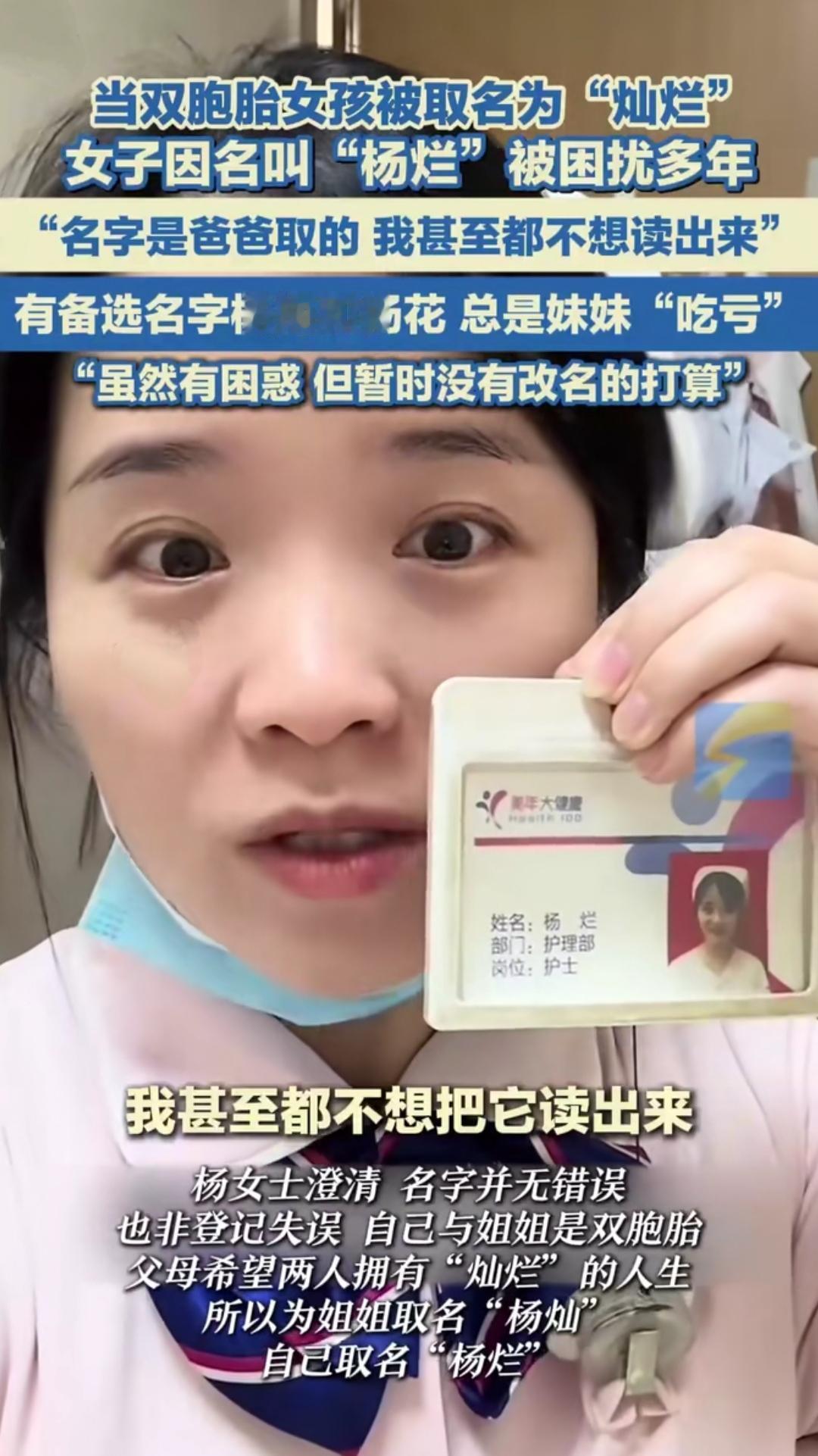 名字能有多影响人生?湖南双胞胎姐妹的名字火了,姐姐叫“杨烂”,妹妹叫“杨灿”,父母本想取“灿烂”之意,结果姐姐却被名字困扰多年! 据姐姐说,从小到大因为“杨烂”这个名字闹了不少笑话,同学朋友总拿名字打趣,甚至工作后还会被同事调侃“名字挺特别”。她也纠结过要不要改名,但每次都因为嫌麻烦搁置,至今仍用着这个充满父母初心的名字。 妹妹“杨灿”的名字则备受好评,寓意阳光灿烂,走到哪儿都让人觉得亲切。网友吵翻了:有人说父母太粗心,取名没考虑谐音;也有人说名字只是代号,没必要太在意。 其实名字里藏着父母的期待,却也可能伴随现实困扰。你觉得姐姐该改名吗?还是接受这份特别的“初心”?