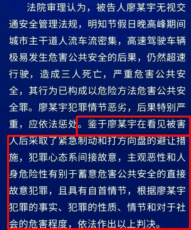 廖某宇的犯罪心态是间接故意, 我仔细翻看了车祸的详细报道, 他的行为不该算间接故意,就是直接故意。 廖某宇和女性朋友吵嘴后,就一脚油门踩到底,持续了14s,车速飚到了129km/h。 限速40km/h的闹市区开这么快,这已是在放任危害结果的发生了。 在过路口时,同车的女性朋友哀求过他:“前面有人,开慢点开慢点”。 女性朋友都说前面有人了,正常情况下就该减速让行,而廖某宇呢,只是短暂的松了一下油门,然后又猛的踩了下去,2s后撞上了胡某一家三口。 这么快的速度撞上去会有什么后果,廖某宇难道不知道吗?明知其危险还是选择了放任,这怎么看都是故意的。 另外,廖某宇撞上胡某一家三口后,并没有第一时间选择施救,先看车、后淡定吸烟、甚至还打电话给朋友调侃”小孩头真硬”。 这是何其的冷血,视他人性命如草芥,这能算“交通肇事”吗,这就是故意杀人,还是“滥杀无辜”。