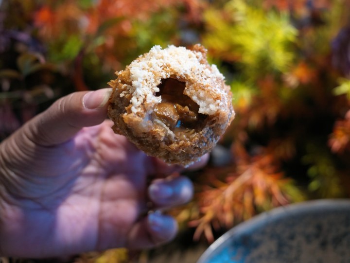 油墩子,脱胎于我们童年记忆里小学门口的油墩儿,当然此处的做法要复杂得多,打破传统用萝卜丝做的馅料,选用时令板栗,萧山进化镇放养的飞鸡,用杭州家烧的技法制作而成,专为这道菜研发的酥炸配方,令菜品外脆酥香,内里爆汁。
