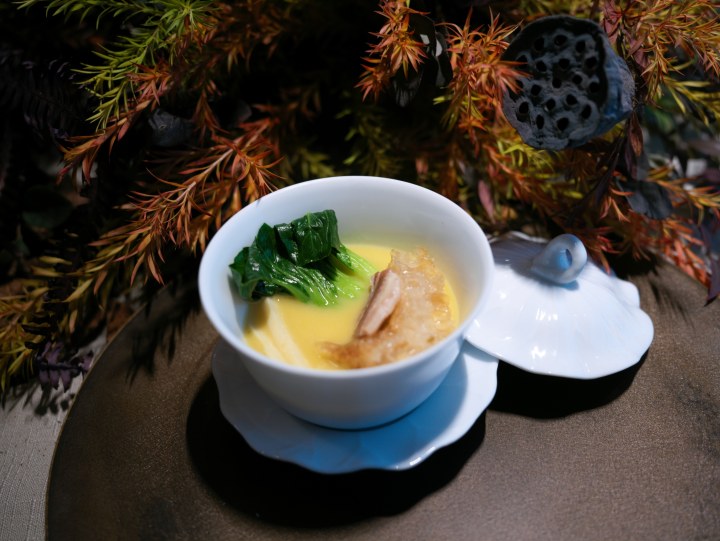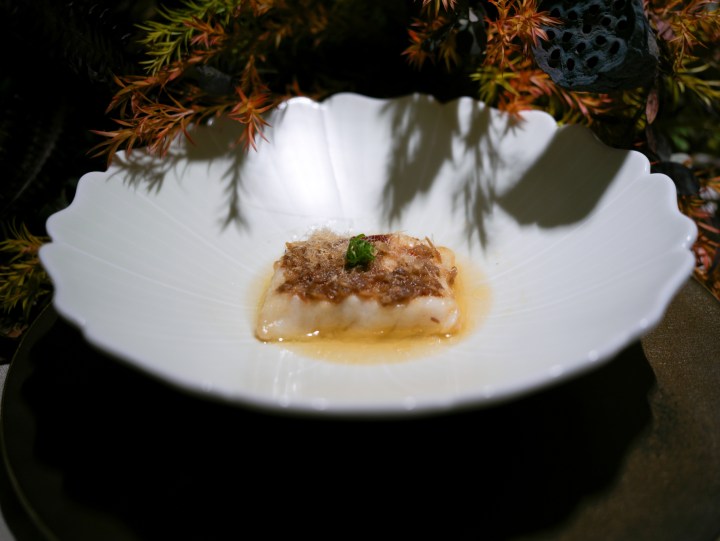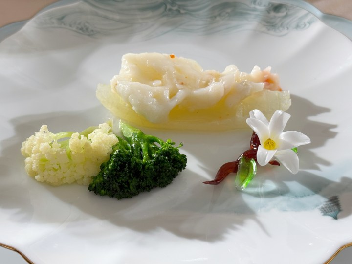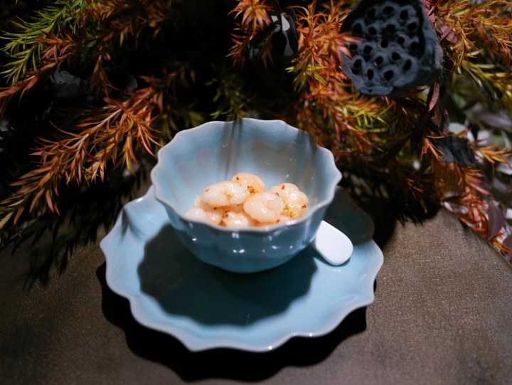 这就是以中国画“景深”为纲,融入中国传统绘画中的笔趣与画意,将菜品特质与西湖冬境、冬梅雅韵相融。“清漪叠碧”翻译过来是翡翠太湖一号,大虾去壳,虾肉极具弹性,主厨朱启金调和出温柔的杭州底味。耗时好几个小时才制成的糖艺花栩栩如生,质感透亮,点题“翡翠”。