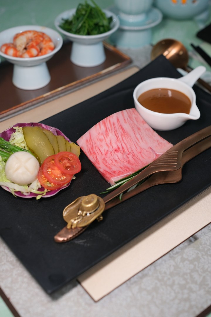 “浓墨炙金”呈现了浓郁的黑松露烤小牛排,再一次,我们被盘子里的传统摆盘所吸引,“三潭印月”、“雷峰塔”和“长桥”(也有人觉得应该是断桥),都很杭州。