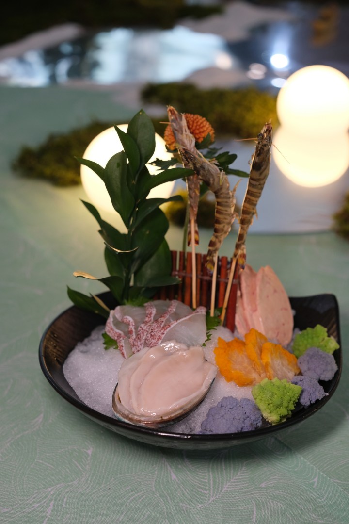 进入冬梅境宴环节,主打好吃。这里可以先说说菜单,中式审美的菜单都是充满意境的,单看名字基本上猜不出是啥菜,像“烟峦缀珍”是冬梅鱼子酱生蚝,我是对着盘子上的装饰物才认定了,因为本身毫无美感的蚝肉“隐藏”得很好,瞬间就诗情画意了。