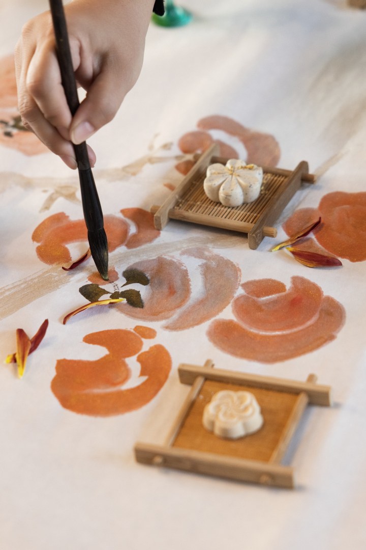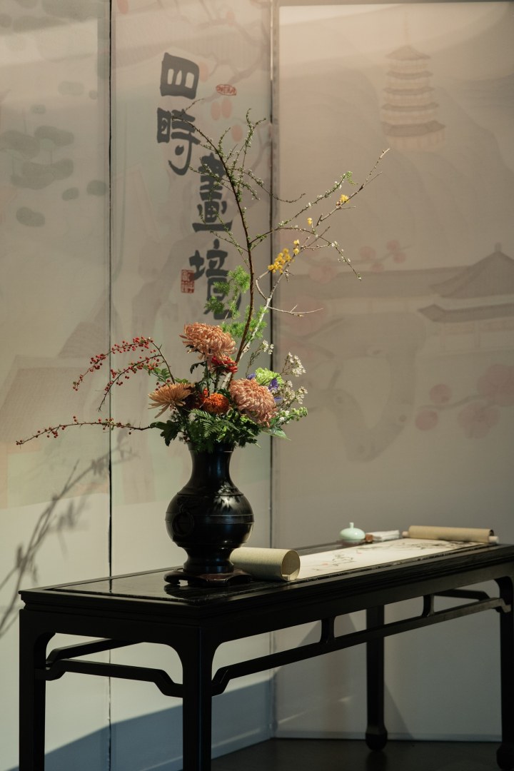“琴茶画游”主打好玩,以“画游”为主线,贯穿春、夏、秋、冬四重篇章,融戏剧、古琴、琵琶、书法、青瓷瓯乐、艺术餐桌、生物电音乐及即兴舞蹈于一体;下篇“冬梅境宴”则通过镜中梅花与书法烛台的交织,创新性地将画境转化为宴席,深度融合文画境美学、文化底蕴与味觉体验。