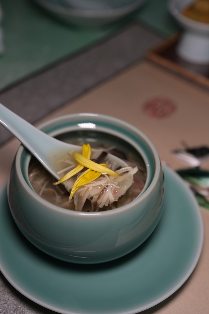通常做宋宴,肯定绕不开蟹酿橙,这次用的是深海珍品松叶蟹,以芙蓉相佐,色清雅,蟹肉味鲜甜柔滑。