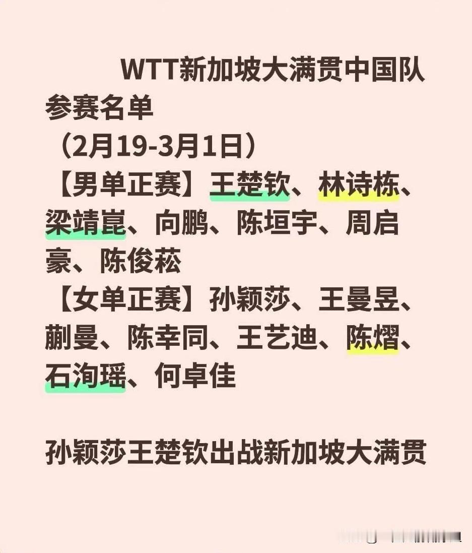 孙颖莎和王楚钦今年春节又不能与父母一起过了吗? 定了,莎头俩要出征新加坡大满贯赛了,正赛时间是2月19至3月1日。 提前两天出发,正好是大年初一,甚至更早,还得有适应场地训练不是? 虽然说很期待看到莎头俩人重返赛场,但又感觉到他俩太辛苦了,不知俩孩子的身体完全恢复了没有…… 祝福莎头健康完赛!加油!