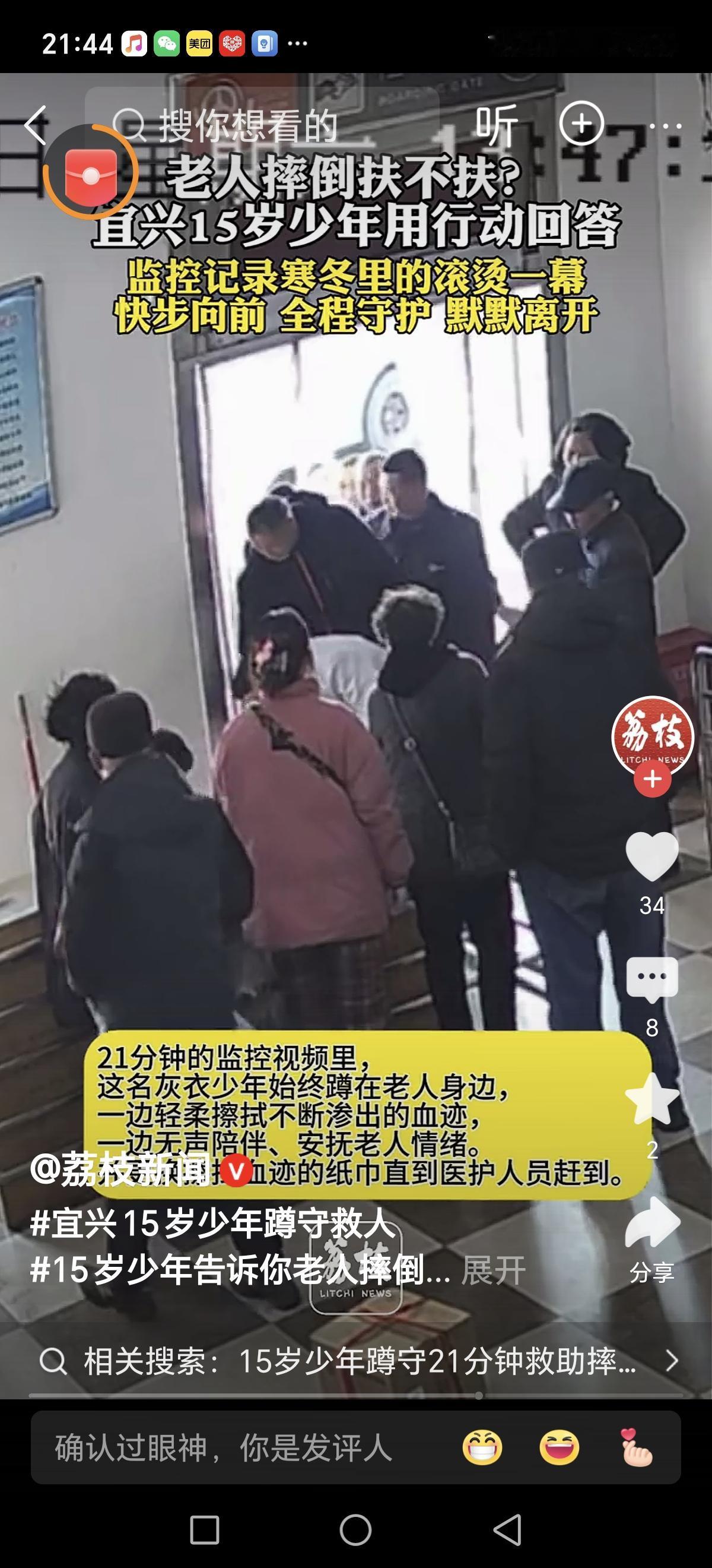 2026年1月3日,江苏宜兴张渚车站候车室发生了一幕温暖人心的善举。一名15岁的初三学生王佳成在候车时,发现一位老人不慎摔倒,立即蹲守了21分钟,展开了细心救助。他用纸巾为老人止血,轻声安抚,陪伴等待救护车的到来。在救援结束后,王佳成悄然离开,没有留下任何痕迹。 这段监控视频被公开后,迅速在社会上引发广泛赞誉。人们纷纷称赞这位少年的善良、坚韧与责任感,认为他的行为展现了青春的正能量,也彰显了社会的温情。 事件意义: **善行的力量:**王佳成用实际行动证明,善意和责任可以在日常生活中传递。即使只是一个学生,他的善举也能温暖他人,激励更多人关注身边的需要。 **青少年的责任感:**这件事彰显了青少年的责任感和社会责任感,提醒我们应培养年轻一代的善良品质和应急能力。 **社会的正能量:**在信息繁杂、负面新闻泛滥的时代,这样的善举为社会带来一股清流,激发全民的善良和互助精神。 社会反响: 事件曝光后,许多网友表示对王佳成的敬佩,同时也呼吁社会更多关注青少年的道德教育,鼓励他们在面对困难时敢于行动,传递正能量。 总结: 王佳成的这次善行不仅救助了一位老人,也温暖了整个社会。他用行动诠释了“助人为乐”的真谛,彰显了青少年的责任与担当。希望这样的善举能够激励更多人,将善意传递下去,共建和谐美好的社会环境。