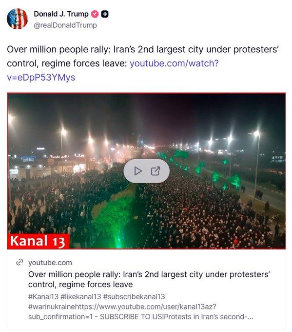 特郎普说,伊朗第二大城市被百万抗议者占据,逼走了政府军。 伊朗人说,当这个城市