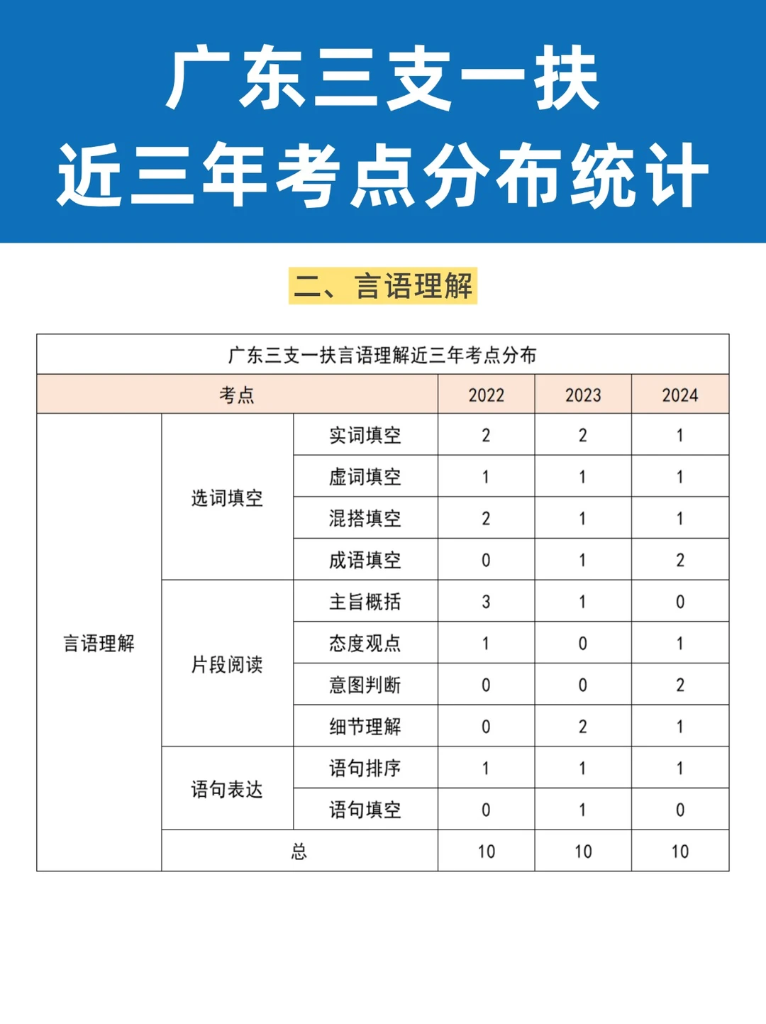 ✅言语理解:10题,选词填空、片段阅读、语句表达