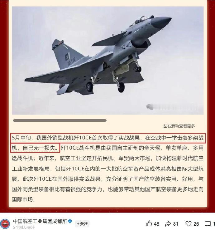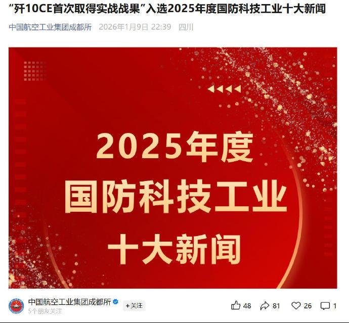 从去年五七空战后,到两百四十八天后的今天,航空工业在2025年国防科技工作十大新闻中,才正式承认歼十CE在国外空军作战中,以零损失击落多架作战飞机,这是中国制造战机在海外的首个实战战果!不知道阿三怎么圆这个谎。