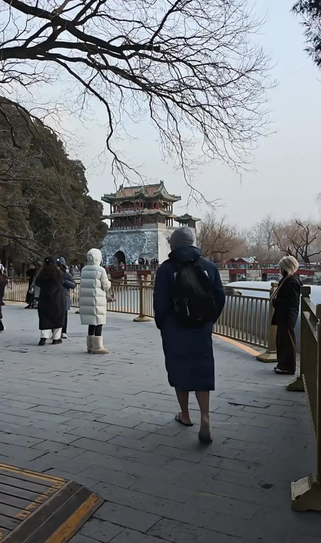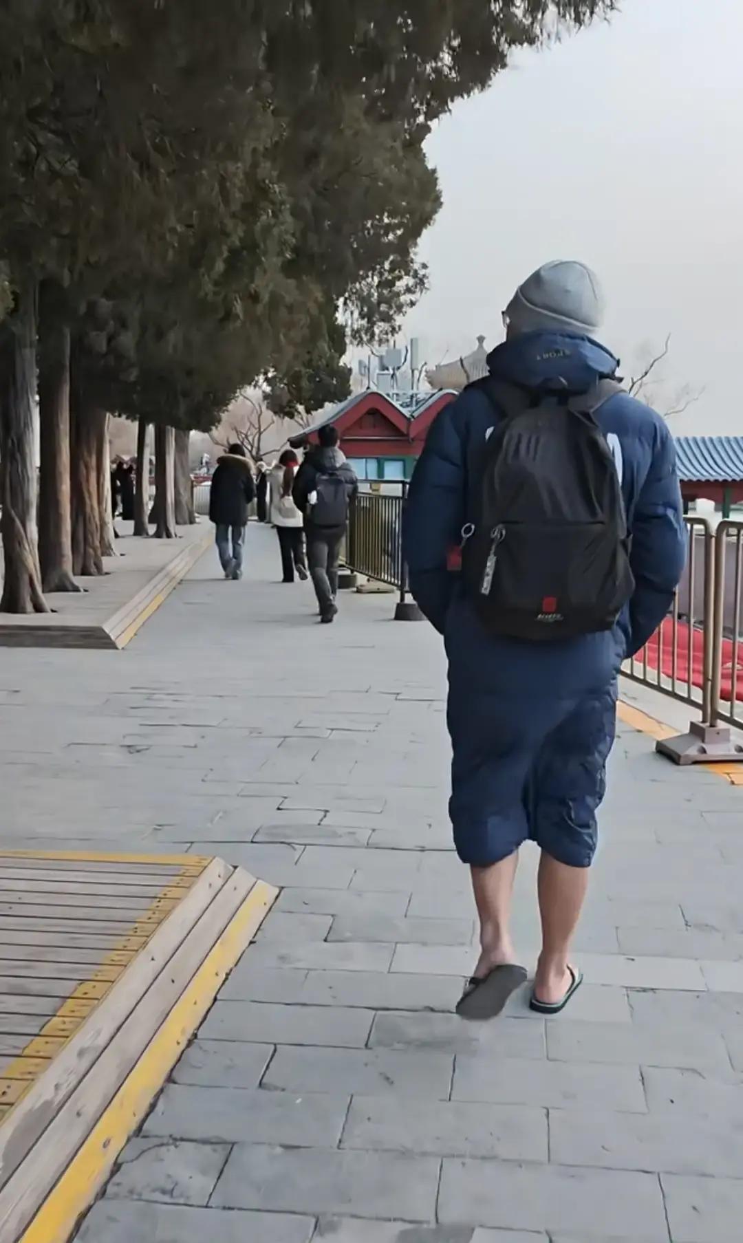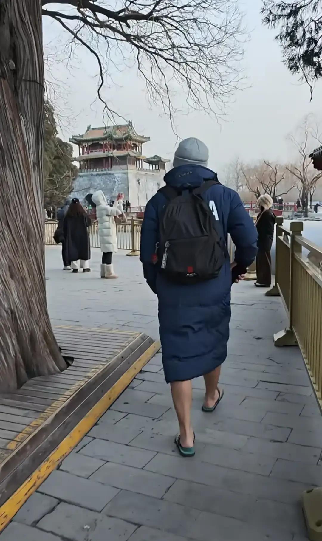 颐和园昆明湖结冰那天,一位大哥裹着长款羽绒服,脚踩蓝色人字拖在雪地里慢悠悠走。 零下五度,他脚背冻得通红,脸上却淡定得像逛早市。 围观游客一边拍一边喊“勇士”,有人猜他刚冬泳上岸,也有人说纯粹想博眼球。 我看那拖鞋底子薄得能看见脚趾缝,真替他脚底板疼。 羽绒服拉到下巴,脚却暴露在冰碴子里,这搭配比湖面的裂缝还离谱。 冬天想红也别拿身体开玩笑,冻坏了还是自己疼。