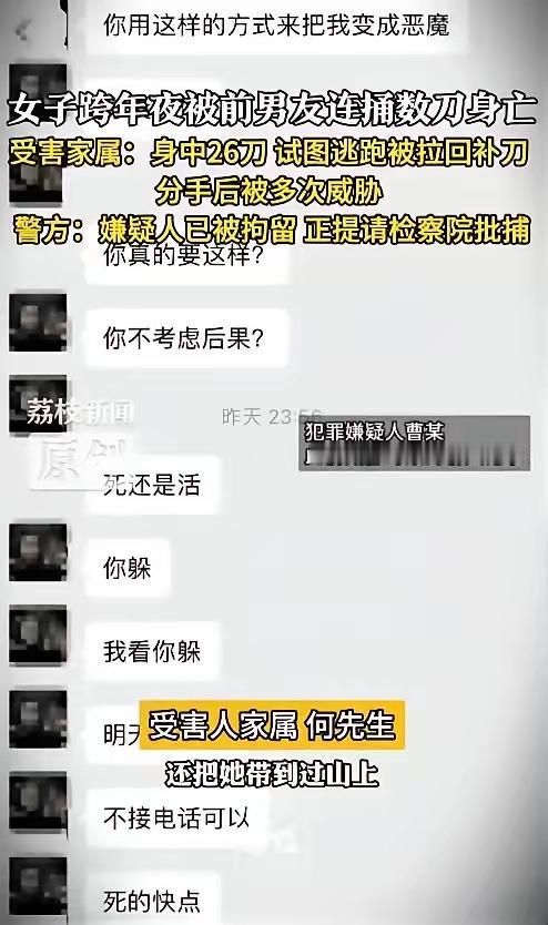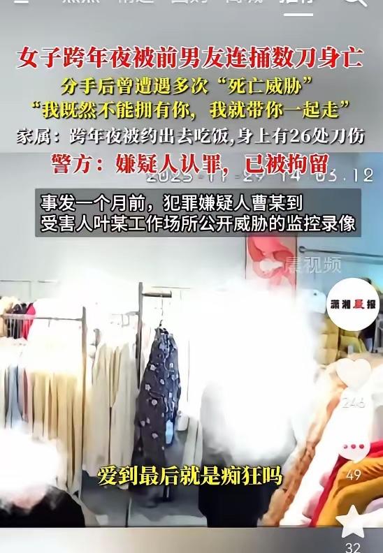 “爱到最后是痴狂!”浙江,一女子跨年夜,被分手2个月的前男友约出去吃饭,饭后,前男友送女子回家,女子惊恐的发现方向不对,她预感到不妙,大喊救命,被男友连捅26刀毙命。家属悲痛欲绝:必须以命偿命! 2026年跨年夜,浙江的25岁女孩小何(化名)接到前男友赖某某的晚餐邀请,尽管两个月前已分手,小何还是答应了这顿"最后的晚餐"。她不知道,这竟是一场死亡之约。 饭后赖某某开车送小何回家,车辆行驶在夜色中,小何突然发现路线不对。她惊恐地大喊救命,推开车门逃跑。赖某某迅速追上去,将小何拉回车内,掏出准备好的刀具疯狂刺向这个曾经爱过的女孩。 经医护人员确认,小何身中多处刀伤,最终因伤势过重抢救无效离世。这个年轻的生命,在新年的第一个凌晨永远定格。行凶后的赖某某没有逃离,而是蹲在现场抽烟,冷静地等待警方到来。这种冷漠态度,正是极端控制型人格的可怕特征。 案发前一个月,赖某某曾闯入小何工作场所公开威胁:"爱到最后就是痴狂,我既然不能拥有你,我就带你一起走"。更早之前赖某某甚至半夜将小何带到山上威胁要杀她,小何曾跪地求饶才得以脱身。这些明显的危险信号,最终没能阻止这起悲剧的发生。 小何的哥哥何先生回忆,妹妹原本计划新年带家人去三亚过年。这个爱笑的女孩喜欢大海,她的手机里还存着悄悄看好的酒店和攻略。如今这些美好计划永远停在了2025年。 何先生一家沉浸在巨大的悲痛中,他们的诉求很明确:希望司法机关能依法严惩凶手,还妹妹一个公道。赖某某的行为已涉嫌故意杀人罪,结合其事前多次威胁、作案手段残忍、案发后未逃离等情节,法院在量刑时可能会从重处罚。 男女朋友分手往往是亲密关系中最危险的时刻,当控制欲强的人感到"失去占有"时,容易产生极端行为。有数据显示,中国约24.7%的女性曾遭遇亲密关系暴力,而分手阶段是暴力致死率最高的时期。许多悲剧发生前,都有明显的预警信号却被忽视掉了。 真正的爱不是占有,而是尊重,当"我爱你"变成"我拥有你",感情就已经变质。赖某某那句"爱到最后是痴狂"的自我辩护,实际上是对爱的扭曲理解。 健康的感情应该让彼此感到自由和安全,而不是恐惧和压抑。任何以爱为名的控制和伤害,都是暴力的伪装。女生要学会识别危险信号,对控制行为零容忍。当感到威胁时,要勇敢求助,用法律保护自己。 各位读者你们怎么看?欢迎在评论区讨论。