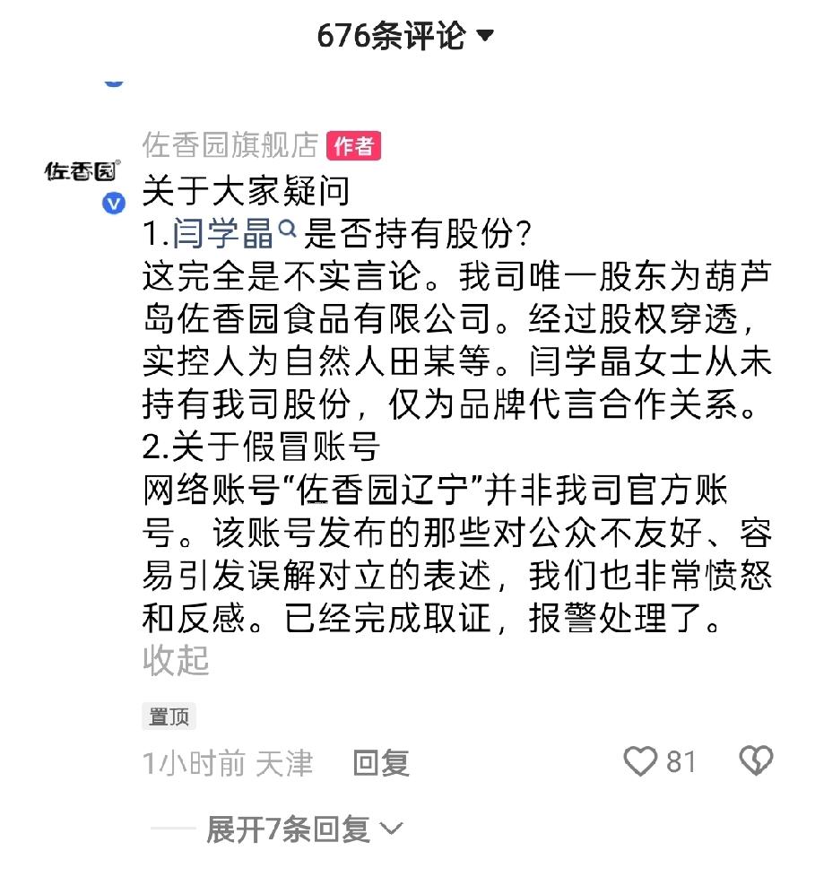 佐香园深夜发文,紧急宣布与闫学晶女士解约,说会尽快推进宣传物料与包材更换工作,让大家看到新的品牌面貌。 最近一段时间,有关于代言人闫学晶女士“酸黄瓜“的言论给佐香园品牌带来很大得影响。而“闫学晶是佐香园股东“及“佐香园辽宁”账号的截图,更是雪上加霜。在这个截图里,标称为“佐香园辽宁”的人与网友互怼,口气格外猖狂,说不缺你一个买货的,我们照样一天进账几千万等等。 这个截图,让网友们的愤怒到达极点,给佐香园造成了很大的损失。 因此,佐香园不但发布了解约通告,还强调了3件事,进行辟谣: 1.闫学晶女士不是我公司的股东(最近网传闫学晶是佐香园股东的谣言很多); 2.“佐香园辽宁”那个账号是假的,佐香园已经报警处理; 3.请大家理智,别传谣别信谣。 佐香园确实拿出品牌的态度,在事情发酵的这段时间态度很诚恳。 同时,也不得不说,这波负面热度还是很难下去。在品牌方如此辟谣解释的情况下,还有很多人带节奏。 网友也好,消费者也好,很多人就愿意相信自己想要相信的“事实”,到现在很多人还是坚信闫学晶是股东,甚至还有人造谣股东“田野”是日本人。 情绪驱动下的谣言往往比真相跑得更快,佐香园的诚恳回应没能完全对冲舆论怒火。 这场风波里,虚假账号挑事、不实信息发酵,叠加公众对明星人设的反感,让品牌陷入“越解释越被动”的困境。想要重建信任,品牌除了清退负面关联,或许还需用更实在的行动,慢慢消解谣言留下的阴霾。